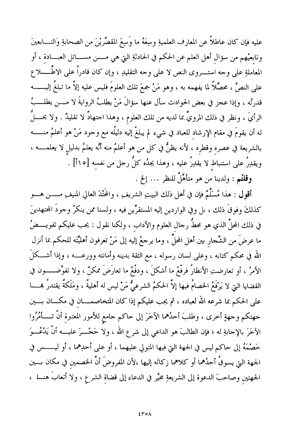 عليه، فإن كان عاطلا عن المعارف العلمية وسعه ما وسع المقصرين من الصحابة والتابعين وتابعيهم من سؤال أهل العلم عن الحكم في الحادثة التي هي من مسائل العبادة، أو المعاملة على وجه استروى النص لا على وجه التقليد، وإن كان قادرًا على الاطلاع على النص، محصلا لما يفهمه به، وهو من جمع تلك العلوم فليس عليه إلا ما تبلغ إليه قدرته، وإذا عجز في بعض الحوادث سأل عنها سؤال من يطلب الرواية لا من يطلب الرأي، ونظر في ذلك المروي بما لديه من تلك العلوم، وهذا اجتهاد لا تقليد. ولا يحل له أن يقوم في مقام الإرشاد للعباد في شيء لم يبلغ إليه دليله مع وجود من هو أعلم منه بالشريعة في عصره وقطره، لأنه يظن في كل من هو أعلم منه أنه يعلم بدليل لا يعلمه، ويقدر على استنباط لا يقدر عليه، وهذا يجده كل رجل من نفسه [15أ].