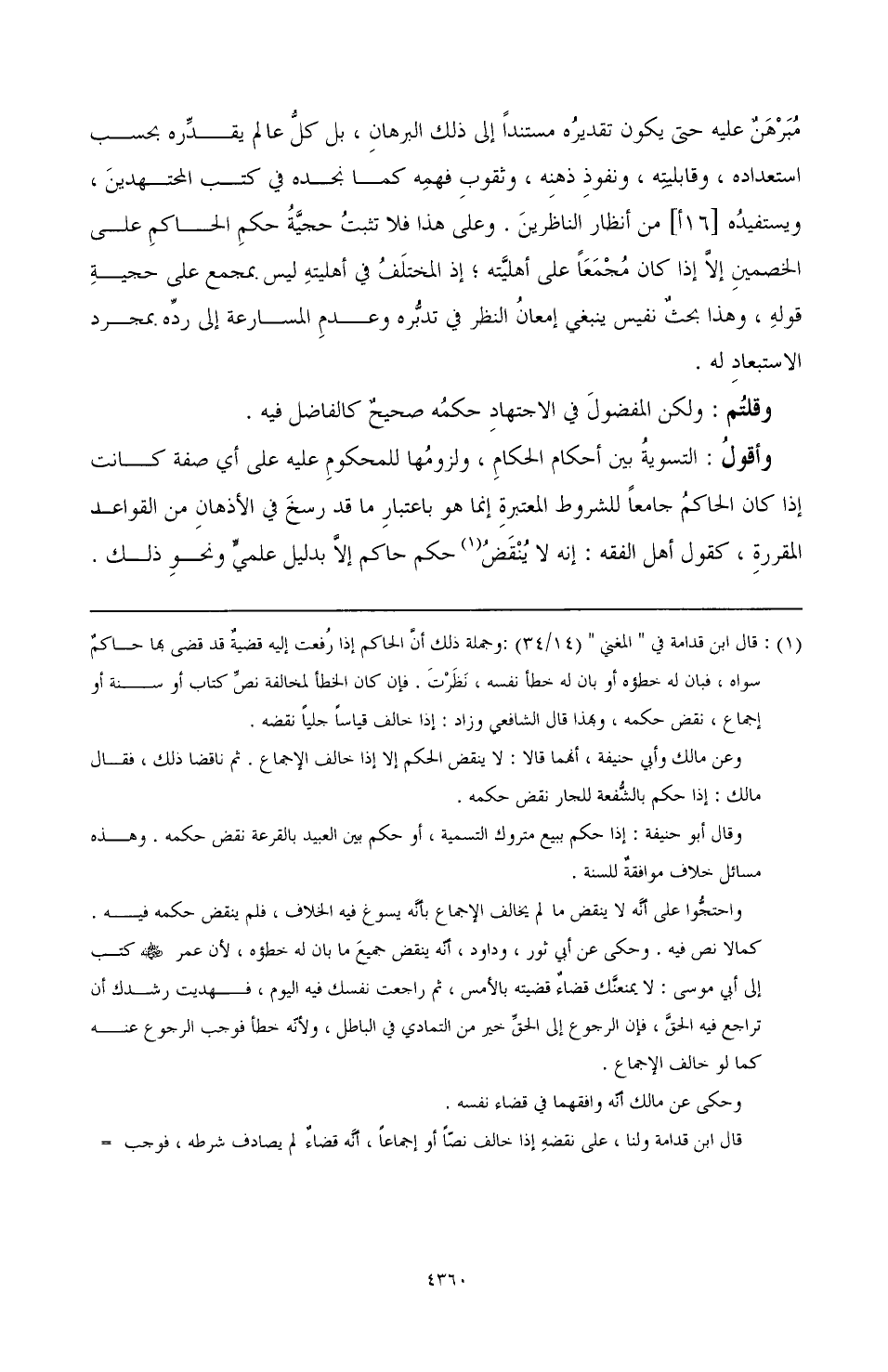 وأقول: التسوية بين أحكام الحكام، ولزومها للمحكوم عليه على أي صفة كانت إذا كان الحاكم جامعًا للشروط المعتبرة إنما هو باعتبار ما قد رسخ في الأذهان من القواعد المقررة، كقول أهل الفقه: إنه لا ينقض (¬1) حكم حاكم إلا بدليل علمي ونحو ذلك.