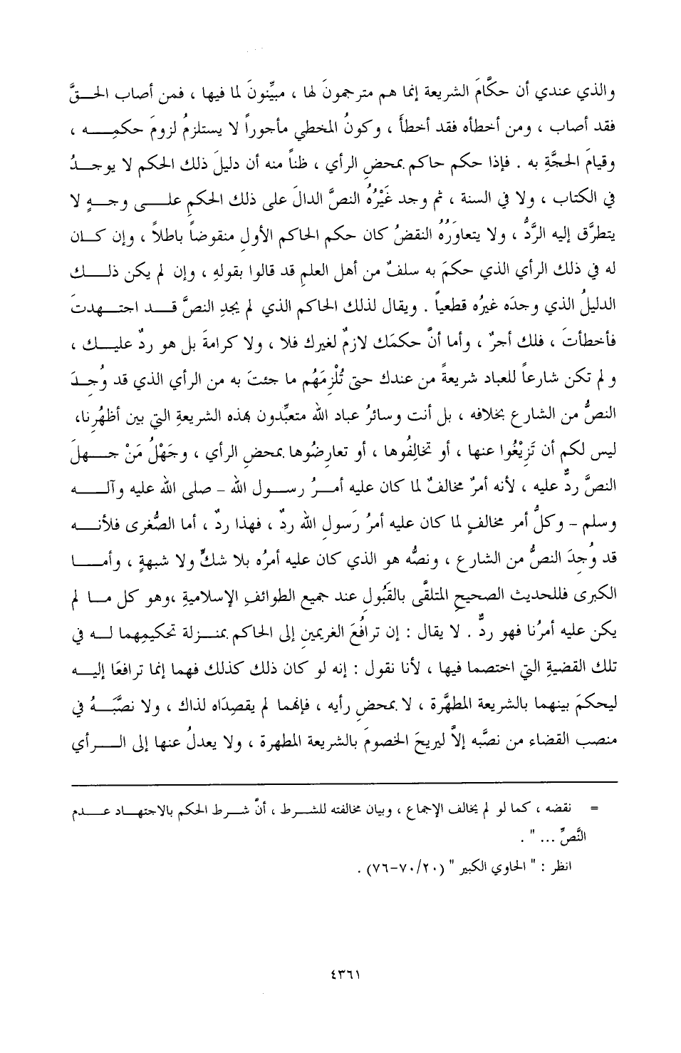 والذي عندي أن حكام الشريعة إنما هم مترجمون لها، مبينون لما فيها، فمن أصاب الحق فقد أصاب، ومن أخطأه فقد أخطأ، وكون المخطي مأجورًا لا يستلزم لزوم حكمه، وقيام الحجة به. فإذا حكم حاكم بمحض الرأي، ظنًا منه أن دليل ذلك الحكم لا يوجد في الكتاب، ولا في السنة، ثم وجد غيره النص الدال على ذلك الحكم على وجه لا يتطرق إليه الرد، ولا يتعاوره النقض كان حكم الحاكم الأول منقوضًا باطلا، وإن كان له في ذلك الرأي الذي حكم به سلف من أهل العلم قد قالوا بقوله، وإن لم يكن ذلك الدليل الذي وجده غيره قطعيًا. ويقال لذلك الحاكم الذي لم يجد النص: قد اجتهدت فأخطأت، فلك أجر، وأما أن حكمك لازم لغيرك فلا، ولا كرامة بل هو رد عليك، ولم تكن شارعًا للعباد شريعة من عندك حتى تلزمهم ما جئت به من الرأي الذي قد وجد النص من الشارع بخلافه، بل أنت وسائر عباد الله متعبدون بهذه الشريعة التي بين أظهرنا، ليس لكم أن تزيغوا عنها، أو تخالفوها، أو تعارضوها بمحض الرأي، وجهل من جهل النص رد عليه، لأنه أمر مخالف لما كان عليه أمر رسول الله - صَلَّى اللهُ عَلَيْهِ وَآلِهِ وَسَلَّمَ -، وكل أمر مخالف لما كان عليه أمر رسول الله رد، فهذا رد، أما الصغرى فلأنه قد وجد النص من الشارع، ونصه هو الذي كان عليه أمره بلا شك ولا شبهة، وأما الكبرى فللحديث الصحيح المتلقى بالقبول عند جميع الطوائف الإسلامية، وهو كل ما لم يكن عليه أمرنا فهو رد. لا يقال: إن ترافع الغريمين إلى الحاكم بمنزلة تحكيمهما له في تلك القضية التي اختصما فيها، لأنا نقول: إنه لو كان ذلك كذلك فهما إنما ترافعا إليه ليحكم بينهما بالشريعة المطهرة، لا بمحض رأيه، فإنهما لم يقصداه لذاك، ولا نصبه في منصب القضاء من نصبه إلا ليريح الخصوم بالشريعة المطهرة، ولا يعدل عنها إلى الرأي