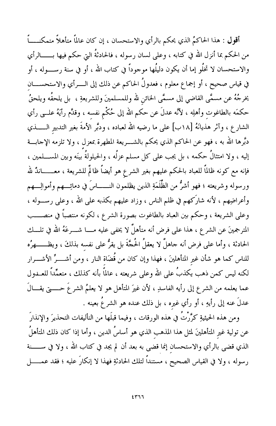 ومن هذه الحيثية كررت في هذه الورقات، وفيما قبلها من التأليفات التحذير والإنذار عن تولية غير المتأهلين لمثل هذا المذهب الذي هو أساس الدين، وأما إذا كان ذلك المتأهل الذي قضى بالرأي والاستحسان إنما قضى به بعد أن لم يجد في كتاب الله، ولا في سنة رسوله، ولا في القياس الصحيح، مستندًا لتلك الحادثة فهذا لا إنكار عليه؛ فقد عمل