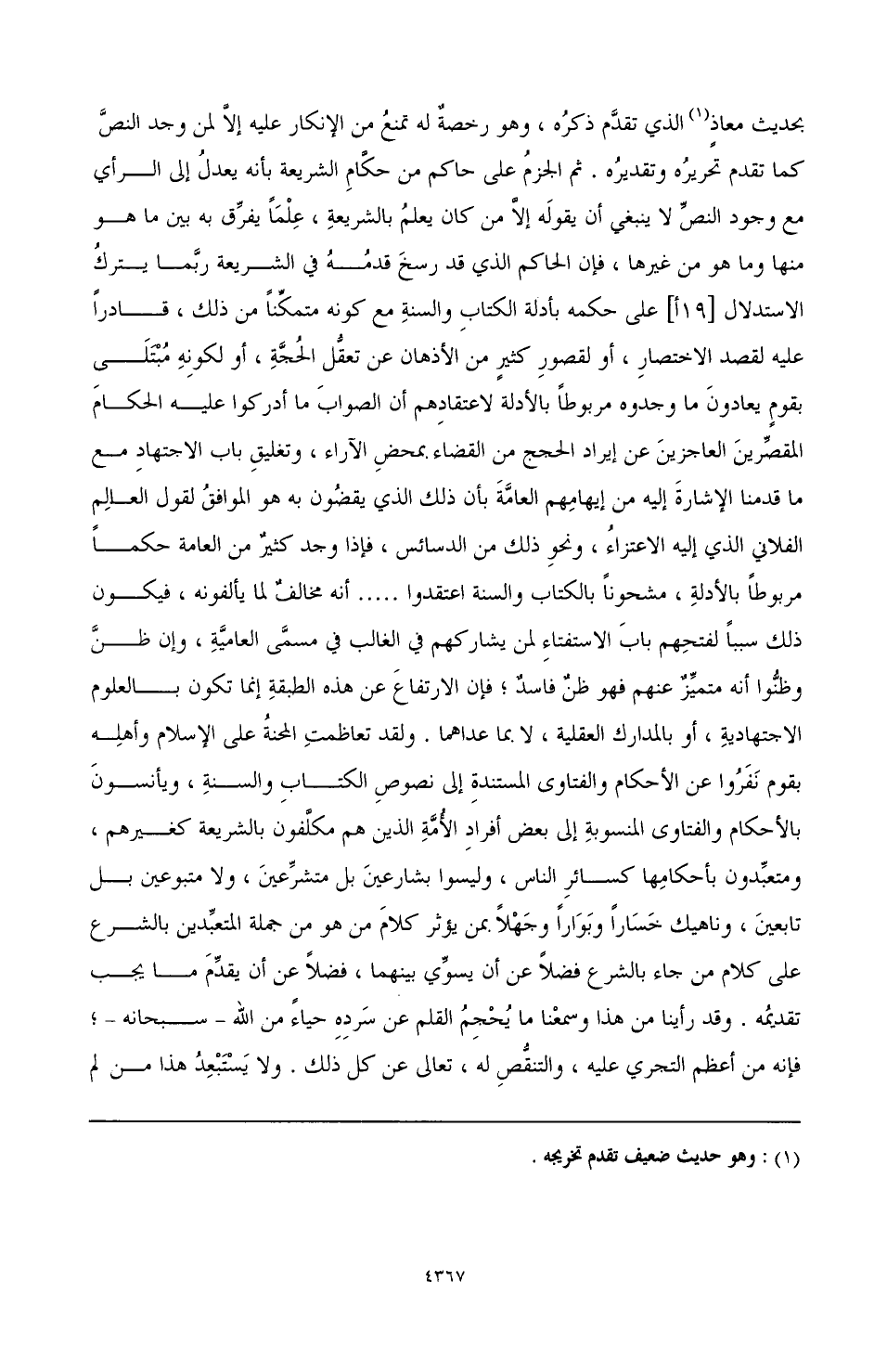 ولقد تعاظمت المحنة على الإسلام وأهله بقوم نفروا عن الأحكام والفتاوى المستندة إلى نصوص الكتاب والسنة، ويأنسون بالأحكام والفتاوى المنسوبة إلى بعض أفراد الأمة الذين هم مكلفون بالشريعة كغيرهم، ومتعبدون بأحكامها كسائر الناس، وليسوا بشارعين بل متشرعين، ولا متبوعين بل تابعين، وناهيك خسارًا وبوارًا وجهلا بمن يؤثر كلام من هو من جملة المتعبدين بالشرع على كلام من جاء بالشرع فضلا عن أن يسوي بينهما، فضلا عن أن يقدم ما يجب تقديمه. وقد رأينا من هذا وسمعنا ما يحجم القلم عن سرده حياءً من الله - سبحانه -؛ فإنه من أعظم التجري عليه، والتنقص له، تعالى عن كل ذلك. ولا يستبعد هذا من لم