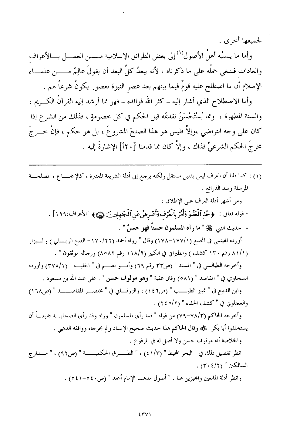 وأما ما ينسبه أهل الأصول (¬1) إلى بعض الطرائق الإسلامية من العمل بالأعراف والعادات فينبغي حمله على ما ذكرناه، لأنه يبعد كل البعد أن يقول عالم من علماء الإسلام أن ما اصطلح عليه قوم فيما بينهم بعد عصر النبوة بعصور يكون شرعًا لهم.