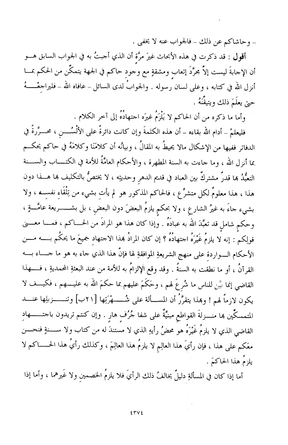 فليعلم - أدام الله بقاءه - أن هذه الكلمة وإن كانت دائرة على الألسن، محررة في الدفاتر ففيها من الإشكال ما لا يحيط به المقال، وبيانه أن كلامنا وكلامه في حاكم يحكم بما أنزل الله، وما جاءت به السنة المطهرة، والأحكام العامة للأمة في الكتاب والسنة التعبد بها قدر مشترك بين العباد في قديم الدهر وحديثه، لا يختص بالتكليف بها هذا دون هذا، هذا معلوم لكل متشرع، فالحاكم المذكور هو لم يأت بشيء من تلقاء نفسه، ولا بشيء جاء به غير الشارع، ولا بحكم يلزم البعض دون البعض، بل بشريعة عامة، وحكم شامل قد تعبد الله به عباده.