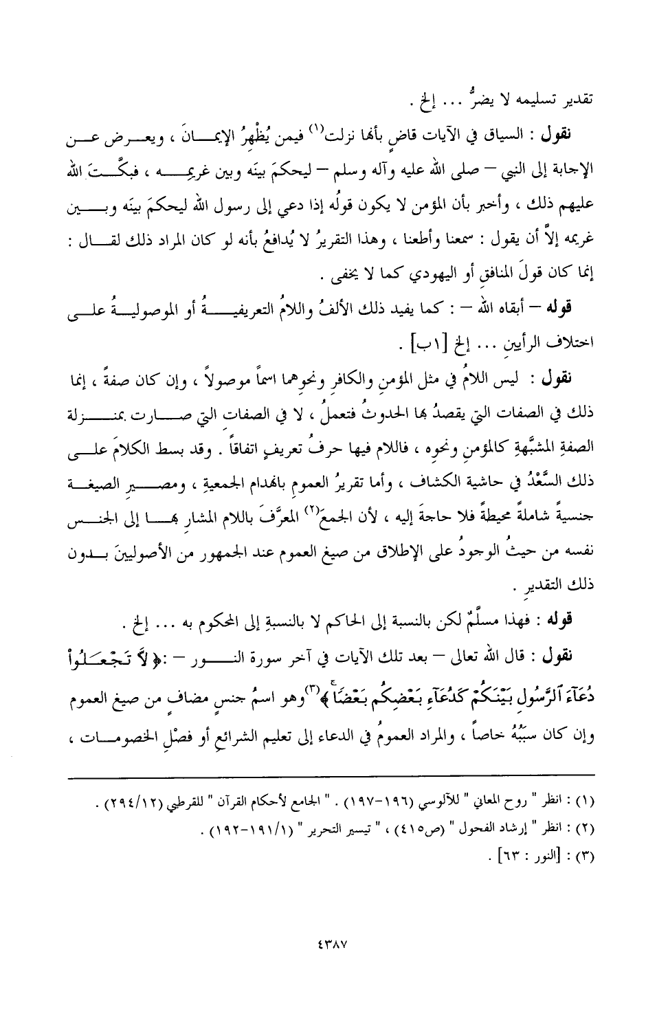 نقول: قال الله تعالى - بعد تلك الآيات في آخر سورة النور -: {لا تجعلوا دعاء الرسول بينكم كدعاء بعضكم بعضا} (¬3) وهو اسم جنس مضاف من صيغ العموم وإن كان سببه خاصًا، والمراد العموم في الدعاء إلى تعليم الشرائع أو فصل الخصومات،
