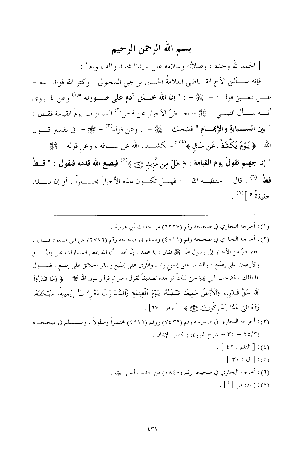 فإنه سألني الأخ القاضي العلامة الحسن بن يحيى السحولي- وكثر الله فوائده- عن معنى قوله-صَلَّى اللهُ عَلَيْهِ وَسَلَّمَ: " إن الله خلق آدم على صورته" (¬1) وعن المروي أنه سأل النبي- صَلَّى اللهُ عَلَيْهِ وَسَلَّمَ- بعض الأحبار عن قبض (¬2) السماوات يوم القيامة فقال: " بين السبابة والإبهام " فضحك- صَلَّى اللهُ عَلَيْهِ وَسَلَّمَ-، وعن قوله (¬3) - صَلَّى اللهُ عَلَيْهِ وَسَلَّمَ في تفسير قول الله:} يوم يكشف عن ساق {(¬4) أنه يكشف الله عن ساقه، وعن قوله- صَلَّى اللهُ عَلَيْهِ وَسَلَّمَ-: " إن جهنم تقول يوم القيامة:} هل من مزيد {(¬5) فيضع الله قدمه فتقول: " قط قط" (¬6). قال- حفظه الله-: فهل تكون هذه الأخبار مجازا، أو إن ذلك حقيقة؟] (¬7).