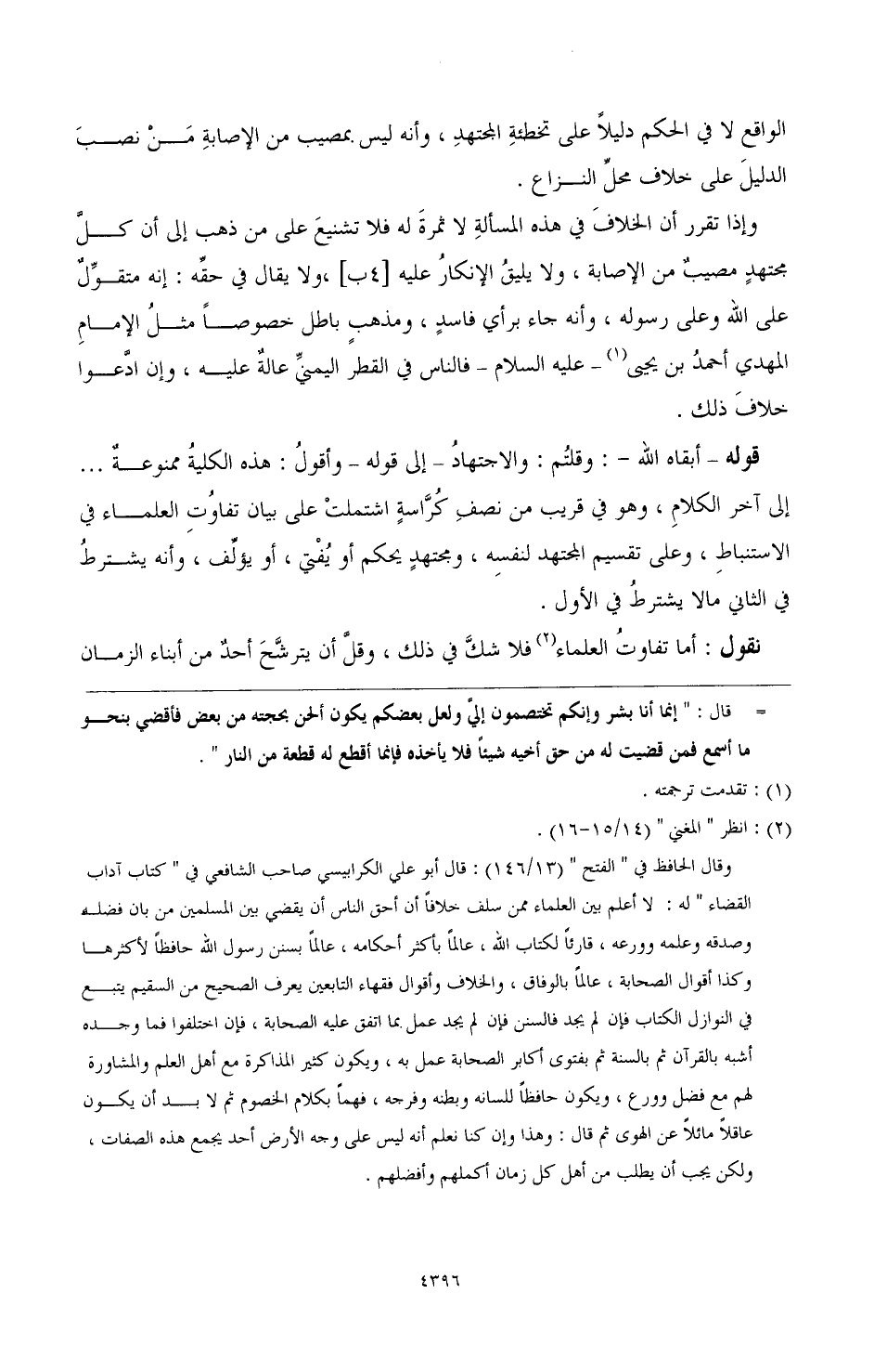 قوله - أبقاه الله -: وقلتم: والاجتهاد - إلى قوله - وأقول: هذه الكلية ممنوعة ... إلى آخر الكلام، وهو قريب من نصف كراسة اشتملت على بيان تفاوت العلماء في الاستنباط، وعلى تقسيم المجتهد لنفسه، ومجتهد يحكم أو يفتي، أو يؤلف، وأنه يشترط في الثاني ما لا يشترط في الأول.