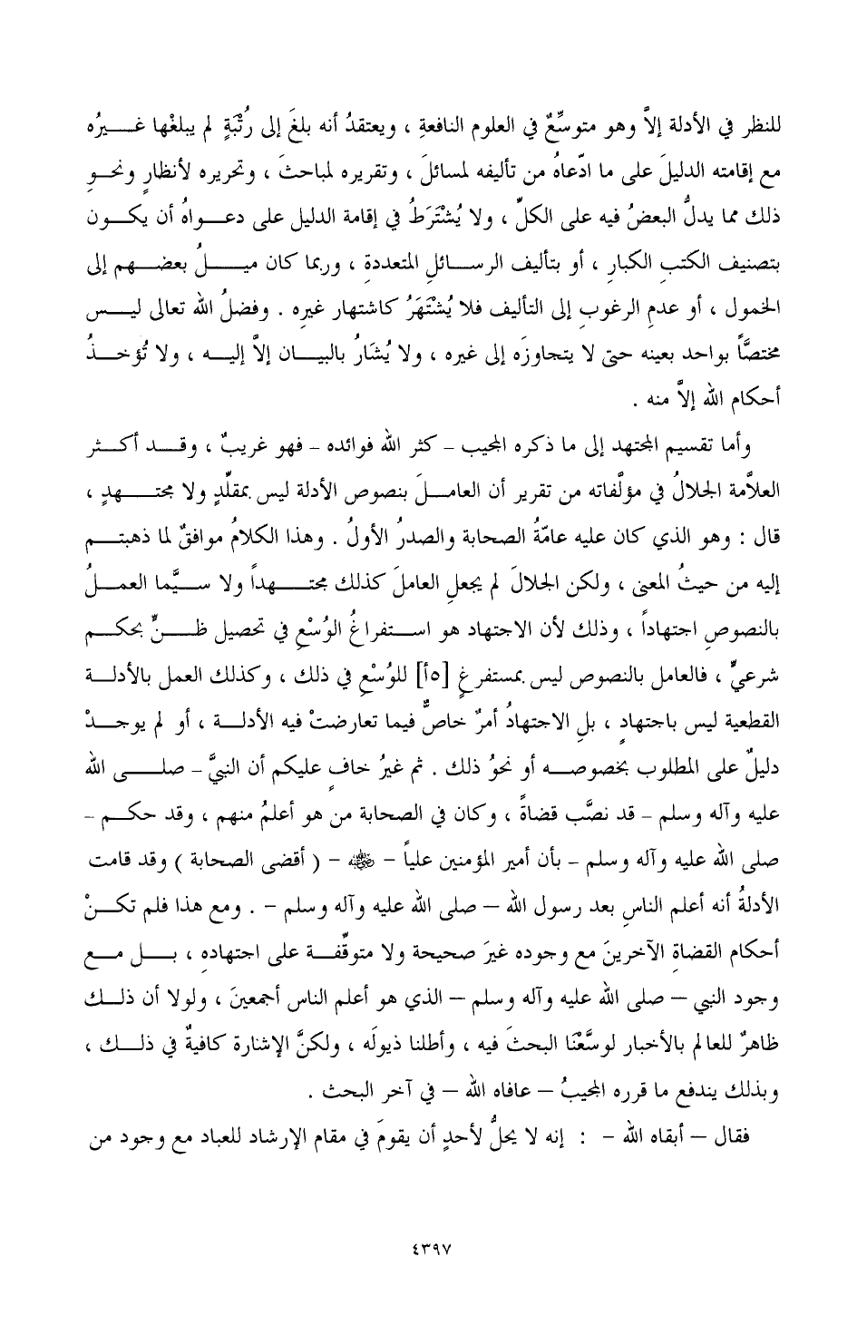 وأما تقسيم المجتهد إلى ما ذكره المجيب - كثر الله فوائده - فهو غريب، وقد أكثر العلامة الجلال في مؤلفاته من تقرير أن العامل بنصوص الأدلة ليس بمقلد ولا مجتهد، قال: وهو الذي كان عليه عامة الصحابة والصدر الأول. وهذا الكلام موافق لما ذهبتم إليه من حيث المعنى، ولكن الجلال لم يجعل العامل كذلك مجتهدًا ولا سيما العمل بالنصوص اجتهادًا، وذلك لأن الاجتهاد هو استفراغ الوسع في تحصيل ظن بحكم شرعي، فالعامل بالنصوص ليس بمستفرغ [5أ] للوسع في ذلك، وكذلك العمل بالأدلة القطعية ليس باجتهاد، بل الاجتهاد أمر خاص فيما تعارضت فيه الأدلة، أو لم يوجد دليل على المطلوب بخصوصه أو نحو ذلك. ثم غير خاف عليكم أن النبي - صَلَّى اللهُ عَلَيْهِ وَآلِهِ وَسَلَّمَ - قد نصب قضاة، وكان في الصحابة من هو أعلم منهم، وقد حكم - صَلَّى اللهُ عَلَيْهِ وَآلِهِ وَسَلَّمَ - بأن أمير المؤمنين عليًا - رضي الله عنه - (أقضى الصحابة) وقد قامت الأدلة أنه أعلم الناس بعد رسول الله - صَلَّى اللهُ عَلَيْهِ وَآلِهِ وَسَلَّمَ -. ومع هذا فلم تكن أحكام القضاة الآخرين مع وجوده غير صحيحة ولا متوقفة على اجتهاده، بل مع وجود النبي - صَلَّى اللهُ عَلَيْهِ وَآلِهِ وَسَلَّمَ - الذي هو أعلم الناس أجمعين، ولولا أن ذلك ظاهر للعالم بالأخبار لوسعنا البحث فيه، وأطلنا ذيوله، ولكن الإشارة كافية في ذلك، وبذلك يندفع ما قرره المجيب - عافاه الله - في آخر البحث.