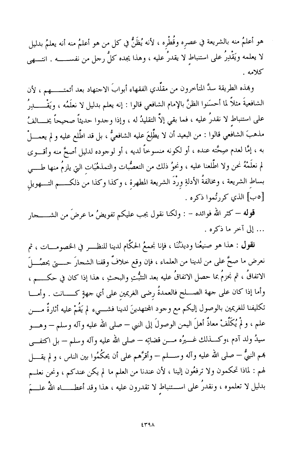 وبهذه الطريقة سد المتأخرون من مقلدي الفقهاء أبواب الاجتهاد بعد أئمتهم، لأن الشافعية مثلا لما أحسنوا الظن بالإمام الشافعي قالوا: إنه يعلم بدليل لا نعلمه، ويقدر على استنباط لا نقدر عليه، فما بقي إلا التقليد له، وإذا وجدوا حديثًا صحيحًا يخالف مذهب الشافعي قالوا: من البعيد أن لا يطلع عليه الشافعي، بل قد اطلع عليه ولم يعمل به، إما لعدم صحته عنده، أو لكونه منسوخًا لديه، أو لوجوده لدليل أصح منه وأقوى لم نعلمه نحن ولا اطلعنا عليه، ونحو ذلك من التعصبات والتمذهبات التي يلزم منها طي بساط الشريعة، ومخالفة الأدلة ورد الشريعة المطهرة، وكذا وكذا من ذلكم التهويل [5ب] الذي كررتموا ذكره.