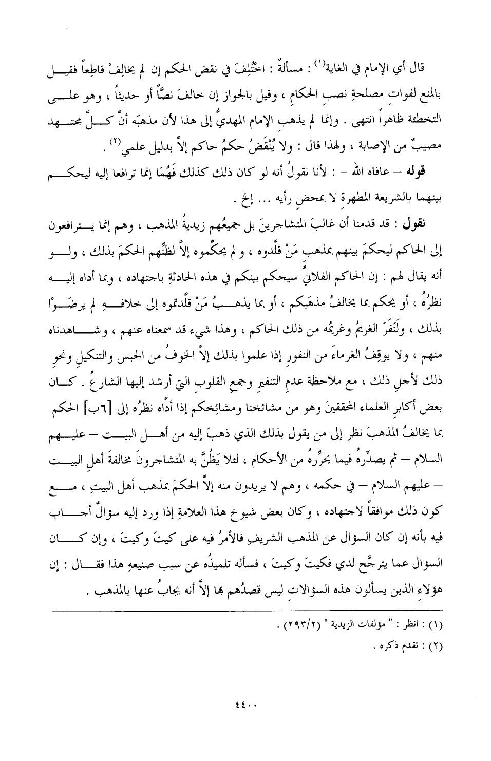 نقول: قد قدمنا أن غالب المتشاجرين بل جميعهم زيدية المذهب، وهم إنما يترافعون إلى الحاكم ليحكم بينهم بمذهب من قلدوه، ولم يحكموه إلا لظنهم الحكم بذلك، ولو أنه يقال لهم: إن الحاكم الفلاني سيحكم بينكم في هذه الحادثة باجتهاده، وبما أداه إليه نظره، أو يحكم بما يخالف مذهبكم، أو بما يذهب من قلدتموه إلى خلافه لم يرضوا بذلك، ولنفر الغريم وغريمه من ذلك الحاكم، وهذا شيء قد سمعناه عنهم، وشاهدناه منهم، ولا يوقف الغرماء من النفور إذا علموا بذلك إلا الخوف من الحبس والتنكيل ونحو ذلك لأجل ذلك، مع ملاحظة عدم التنفير وجمع القلوب التي أرشد إليها الشارع.