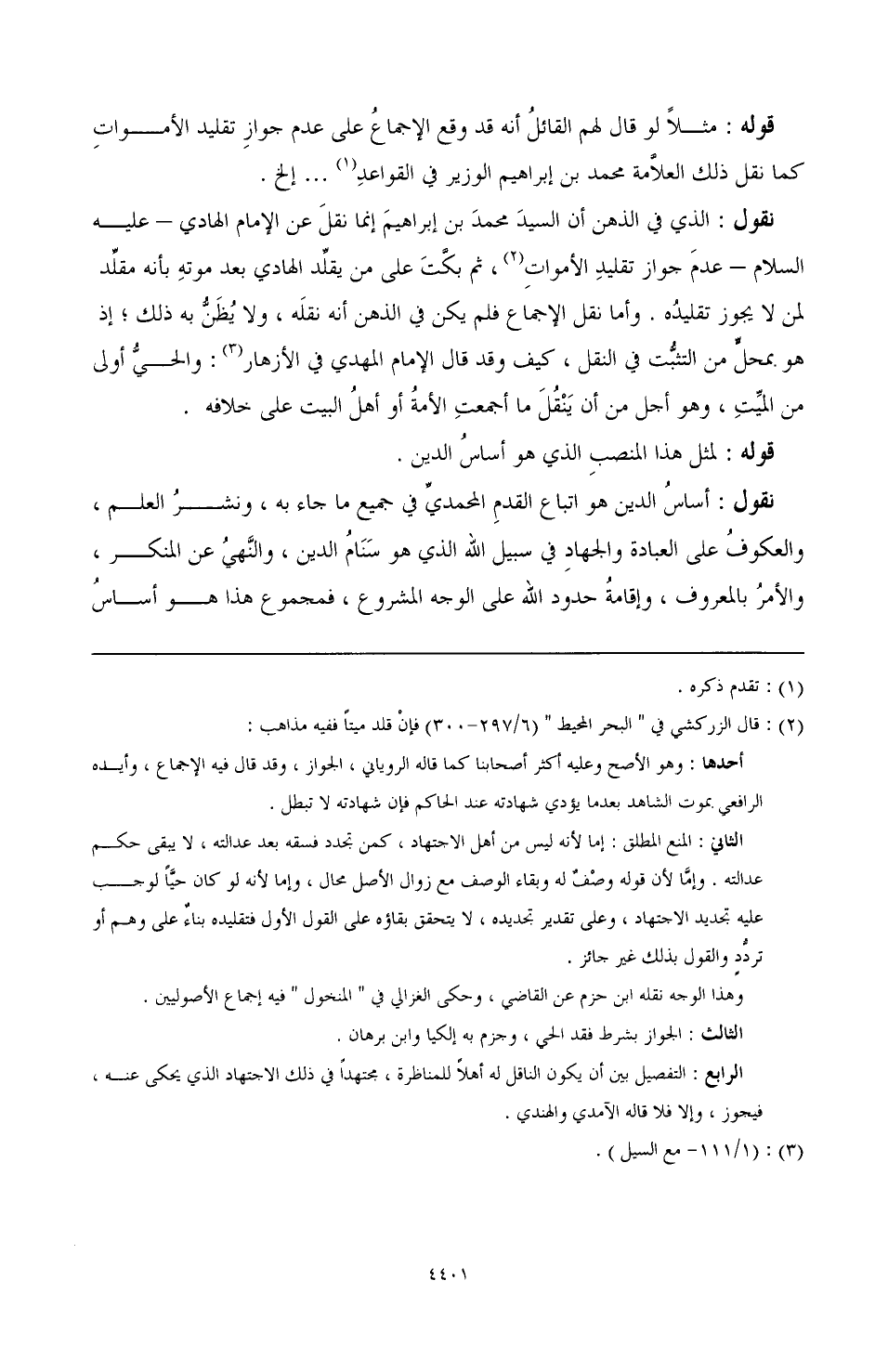 نقول: الذي في الذهن أن السيد محمد بن إبراهيم إنما نقل عن الإمام الهادي - عليه السلام - عدم جواز تقليد الأموات (¬2)، ثم بكت على من يقلد الهادي بعد موته بأنه مقلد لمن لا يجوز تقليده. وأما نقل الإجماع فلم يكن في الذهن أنه نقله، ولا يظن به ذلك؛ إذ هو بمحل من التثبت في النقل، كيف وقد قال الإمام المهدي في الأزهار (¬3): والحي أولى من الميت، وهو أجل من أن ينقل ما أجمعت الأمة أو أهل البيت على خلافه.