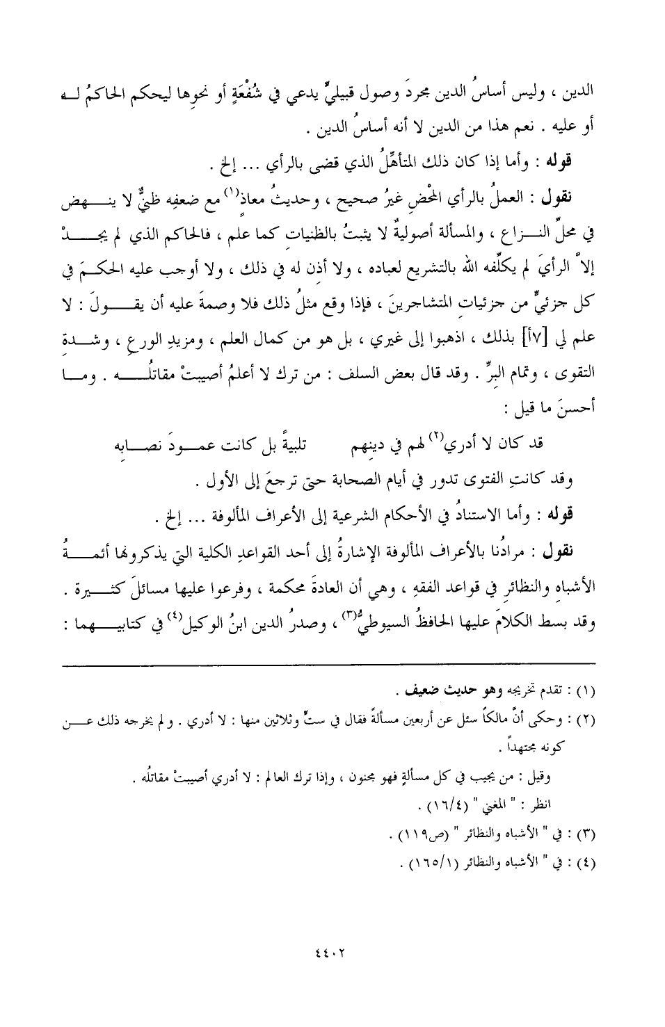 نقول: العمل بالرأي المحض غير صحيح، وحديث معاذ (¬1) مع ضعفه ظني لا ينهض في محل النزاع، والمسألة أصولية لا يثبت بالظنيات كما علم، فالحاكم الذي لم يجد إلا الرأي لم يكلفه الله بالتشريع لعباده، ولا أذن له في ذلك، ولا أوجب عليه الحكم في كل جزئي من جزئيات المتشاجرين، فإذا وقع مثل ذلك فلا وصمة عليه أن يقول: لا علم لي [7أ] بذلك، اذهبوا إلى غيري، بل هو من كمال العلم، ومزيد الورع، وشدة التقوى، وتمام البر. وقد قال بعض السلف: من ترك لا أعلم أصيبت مقاتله. وما أحسن ما قيل: