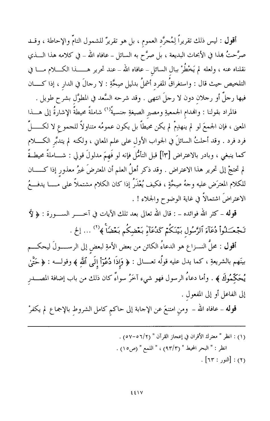 أقول: ليس ذلك تقريرًا لمجرد العموم، بل هو تقرير للشمول التام والإحاطة، وقد صرحت بهذا في الأبحاث البديعة، بل صرح به السائل - عافاه الله - في كلامه هذا الذي نقلناه عنه، ولعله لم يخطر ببال السائل - عافاه الله - عند تحرير هذا الكلام ما في التلخيص حيث قال: واستغراق المفرد أشمل بدليل صحة: لا رجال في الدار، إذا كان فيها رجل أو رجلان دون لا رجل، انتهى. وقد شرحه السعد في المطول بشرح طويل.