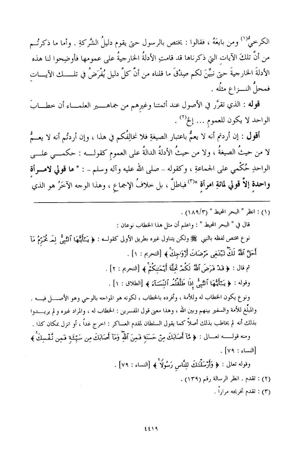 قوله: الذي تقرر في الأصول عند أئمتنا وغيرهم من جماهير العلماء أن خطاب الواحد لا يكون للعموم ... إلخ (¬2).