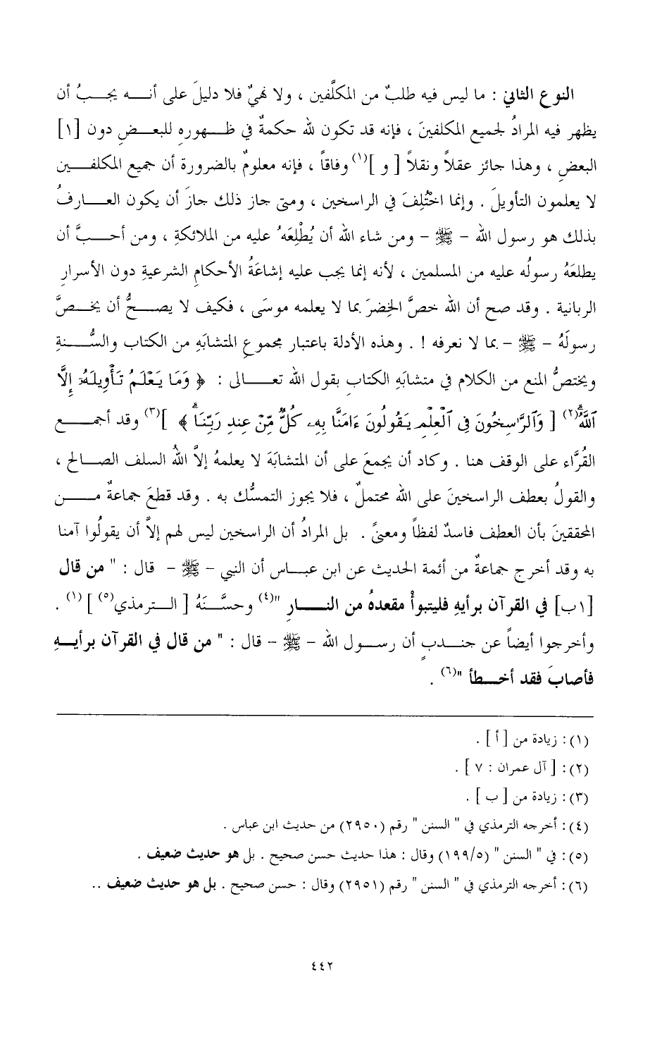 النوع الثاني: ما ليس في فيه طلب من المكلفين، ولا نهي فلا دليل على أنه يجب أن يظهر فيه المراد لجميع المكلفين، فإنه قد تكون لله حكمة في ظهوره للبعض دون [1] البعض، وهذا جائز عقلا ونقلا [و] (¬1) وفاقا، فإنه معلوم بالضرورة أن جميع المكلفين لا يعلمون التأويل. وإنما اختلف في الراسخين، ومتى جاز ذلك جاز أن يكون العارف بذلك هو رسول الله- صَلَّى اللهُ عَلَيْهِ وَسَلَّمَ- ومن شاء الله أن يطلعه عليه من الملائكة، ومن أحب أن يطلعه رسوله عليه من المسلمين، لأنه إنما يجب عليه إشاعة الأحكام الشرعية دون الأسرار الربانية. وقد صح أن الله خص الخضر بما لا يعلمه موسى، فكيف لا يصح أن يخص رسوله- صَلَّى اللهُ عَلَيْهِ وَسَلَّمَ- بما لا نعرفه. وهذه الأدلة باعتبار مجموع المتشابه من الكتاب والسنة ويختص المنع من الكلام في متشابه الكتاب بقول الله تعالى:} وما يعلم تأويله إلا الله {(¬2)} والراسخون في العلم يقولون آمنا به كل من عند ربنا {(¬3) وقد أجمع القراء على الوقف هنا. وكاد أن يجمع على أن المتشابه لا يعلمه إلا الله السلف الصالح، والقول بعطف الراسخين على الله محتمل، فلا يجوز التمسك به. وقد قطع جماعة من المحققين بأن العطف فاسد لفظا ومعنى. بل المراد أن الراسخين ليس لهم إلا أن يقولوا آمنا به وقد أخرج جماعة من أئمة الحديث عن ابن عباس أن النبي- صَلَّى اللهُ عَلَيْهِ وَسَلَّمَ- قال:" من قال [1ب] في القرآن برأيه فليتبوأ مقعده من النار (¬4) وحسنه [الترمذي (¬5)] (¬6) وأخرجوا أيضًا عن جندب أن رسول الله- صَلَّى اللهُ عَلَيْهِ وَسَلَّمَ- قال: " من قال في القران برأيه فأصاب فقد أخطأ " (¬7).