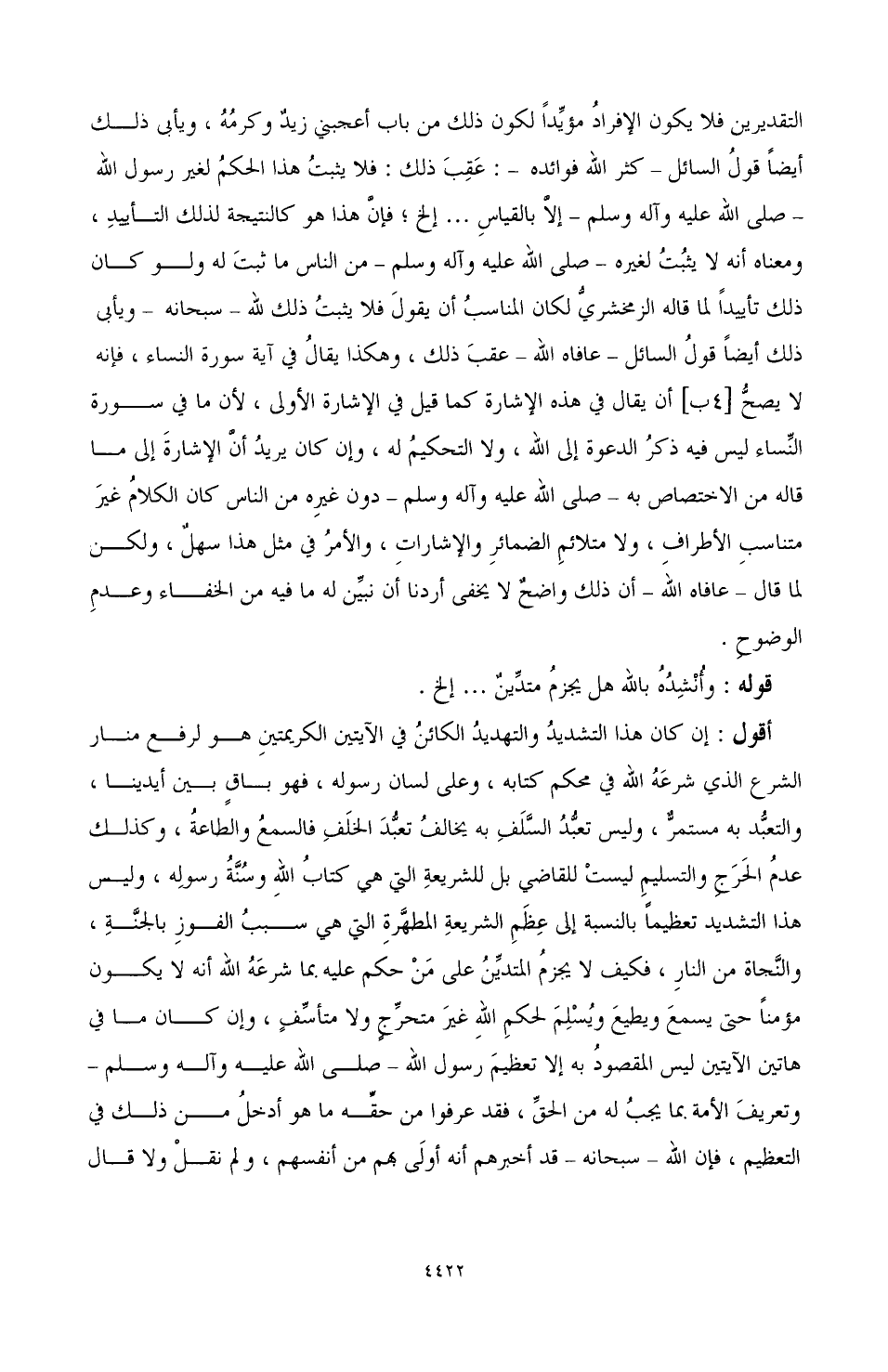 التقديرين فلا يكون الإفراد مؤيدًا لكون ذلك من باب أعجبني زيد وكرمه، ويأبى ذلك أيضًا قول السائل - كثر الله فوائده -: عقب ذلك: فلا يثبت هذا الحكم لغير رسول الله - صَلَّى اللهُ عَلَيْهِ وَآلِهِ وَسَلَّمَ - إلا بالقياس ... إلخ؛ فإن هذا هو كالنتيجة لذلك التأييد، ومعناه أنه لا يثبت لغيره - صَلَّى اللهُ عَلَيْهِ وَآلِهِ وَسَلَّمَ - من الناس ما ثبت له، ولو كان ذلك تأييدًا لما قاله الزمخشري لكان المناسب أن يقول فلا يثبت ذلك لله - سبحانه -، ويأبى ذلك أيضًا قول السائل - عافاه الله - عقب ذلك، وهكذا يقال في آية سورة النساء، فإنه لا يصح [4ب] أن يقال في هذه الإشارة كما قيل في الإشارة الأولى، لأن ما في سورة النساء ليس فيه ذكر الدعوة إلى الله، ولا التحكيم له، وإن كان يريد أن الإشارة إلى ما قاله من الاختصاص به - صَلَّى اللهُ عَلَيْهِ وَآلِهِ وَسَلَّمَ - دون غيره من الناس كان الكلام غير متناسب الأطراف، ولا متلائم الضمائر والإشارات، والأمر في مثل هذا سهل، ولكن لما قال - عافاه الله - إن ذلك واضح لا يخفى أردنا أن نبين له ما فيه من الخفاء وعدم الوضوح.