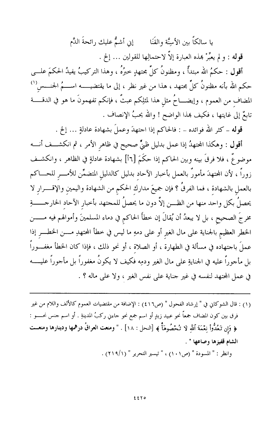 أقول: وهكذا المجتهد إذا عمل بدليل ظني صحيح في ظاهر الأمر، ثم انكشف أنه موضوع، فلا فرق بينه وبين الحاكم إذا حكم [6أ] بشهادة عادلة في الظاهر، وانكشف زورًا، لأن المجتهد مأمور بالعمل بأخبار الآحاد بدليل كالدليل المتضمن للأمر للحاكم بالعمل بالشهادة، فما الفرق؟ فإن جميع مدارك الحكم من الشهادة واليمين والإقرار لا يحصل بكل واحد منها من الظن إلا دون ما يحصل للمجتهد بأخبار الآحاد الخارجة مخرج الصحيح، بل لا يبعد أن يقال إن خطأ الحاكم في دماء المسلمين وأموالهم فيه من الخطر العظيم بالجناية على مال الغير أو على دمه ما ليس في خطأ المجتهد من الخطر إذا عمل باجتهاده في مسألة الطهارة، أو الصلاة، أو نحو ذلك، فإذا كان الخطأ مغفورًا بل مأجورًا عليه في الجناية على مال الغير ودمه فكيف لا يكون مغفورا بل مأجورا عليه في عمل المجتهد لنفسه في غير جناية على نفس الغير، ولا على ماله؟.