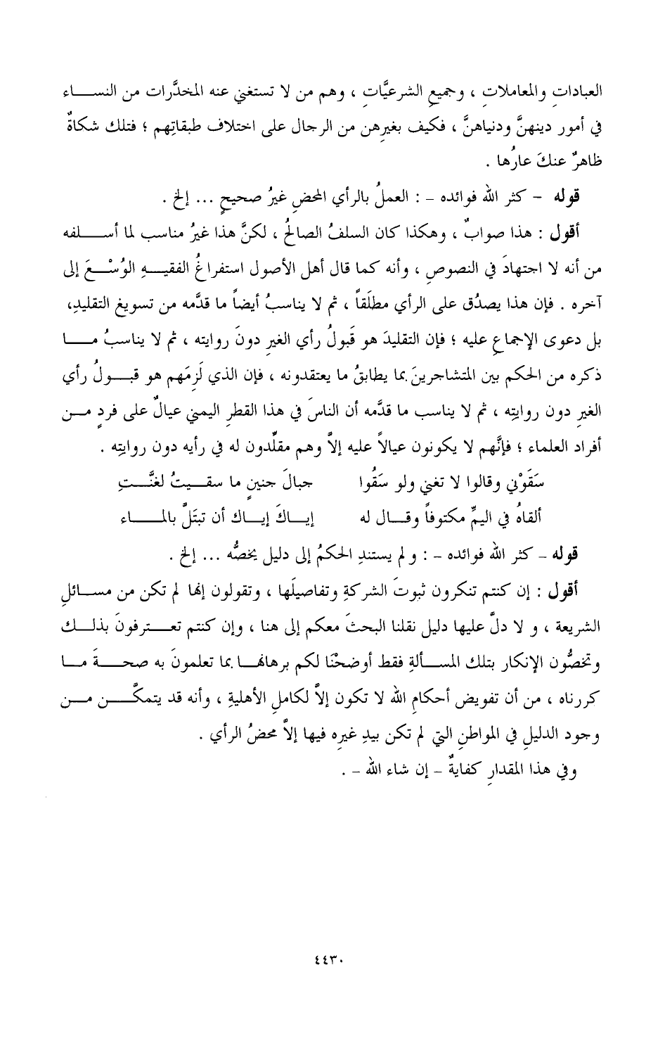 أقول: هذا صواب، وهكذا السلف الصالح، لكن هذا غير مناسب لما أسلفه من أنه لا اجتهاد في النصوص، وأنه كما قال أهل الأصول استفراغ الفقيه الوسع إلى آخره. فإن هذا يصدق على الرأي مطلقًا، ثم لا يناسب أيضًا ما قدمه من تسويغ التقليد، بل دعوى الإجماع عليه؛ فإن التقليد هو قبول رأي الغير دون روايته، ثم لا يناسب ما ذكره من الحكم بين المتشاجرين بما يطابق ما يعتقدونه، فإن الذي لزمهم هو قبول رأي الغير دون روايته، ثم لا يناسب ما قدمه أن الناس في هذا القطر اليمني عيال على فرد من أفراد العلماء؛ فإنهم لا يكونون عيالا عليه إلا وهم مقلدون له في رأيه دون روايته.