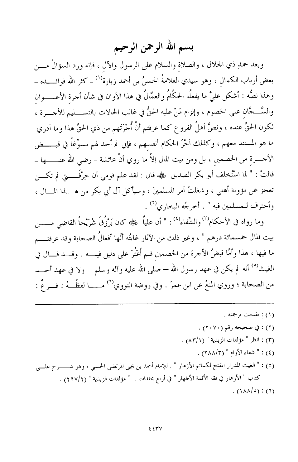 وبعد حمد ذي الجلال، والصلاة والسلام على الرسول والآل، فإنه ورد السؤال من بعض أرباب الكمال، وهو سيدي العلامة الحسن بن زبارة (¬1) - كثر الله فوائده - وهذا نصه: أشكل علي ما يفعله الحكام والعمال في هذا الأوان في شأن أجرة الأعوان والسجان على الخصوم، وإلزام من عليه الحق في غالب الحالات بالتسليم للأجرة، لكون الحق عنده، ونص أهل الفروع كما عرفتم أن أجرتهم من ذي الحق هذا وما أدري ما هو المستند معهم، وكذلك أجر الحكام أنفسهم، فإني لم أجد لهم مسوغًا في قبض الأجرة من الخصمين، بل ومن بيت المال إلا ما روي أن عائشة - رضي الله عنها - قالت: " لما استخلف أبو بكر الصديق - رضي الله عنه - قال: لقد علم قومي أن حرفتي لم تكن تعجز عن مؤونة أهلي، وشغلت أمر المسلمين، وسيأكل آل أبي بكر من هذا المال، وأحترف للمسلمين فيه ". أخرجه البخاري (¬2).