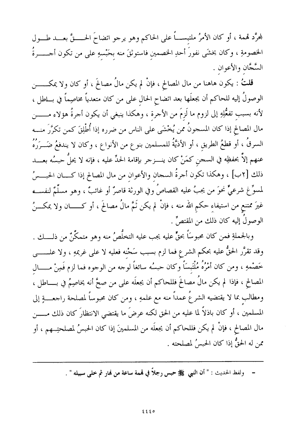قلت: يكون هاهنا من مال المصالح، فإن لم يكن مال مصالح، أو كان ولا يمكن الوصول إليه للحاكم أن يجعلها بعد اتضاح الحال على من كان متعديًا مخاصمًا في باطل، لأنه بسبب تفعله إلى لزوم ما لزم من الأجرة، وهكذا ينبغي أن يكون أجرة هؤلاء من مال المصالح إذا كان المسجون ممن يخشى على الناس من ضرره إذا أطلق كمن تكرر منه السرق، أو قطع الطريق، أو الأذية للمسلمين بنوع من الأنواع، وكان لا يندفع ضرره عنهم إلا بحفظه في السجن كمن كان ينزجر بإقامة الحد عليه، فإنه لا يحل حبسه بعد ذلك [2ب] , وهكذا تكون أجرة السجان والأعوان من مال المصالح إذا كان الحبس لمسوغ شرعي نحو من يجب عليه القصاص، وفي الورثة قاصر أو غائب، وهو مسلم لنفسه غير ممتنع من استيفاء حكم الله منه، فإن لم يكن ثم مال مصالح، أو كان ولا يمكن الوصول إليه كان ذلك من المقتص.