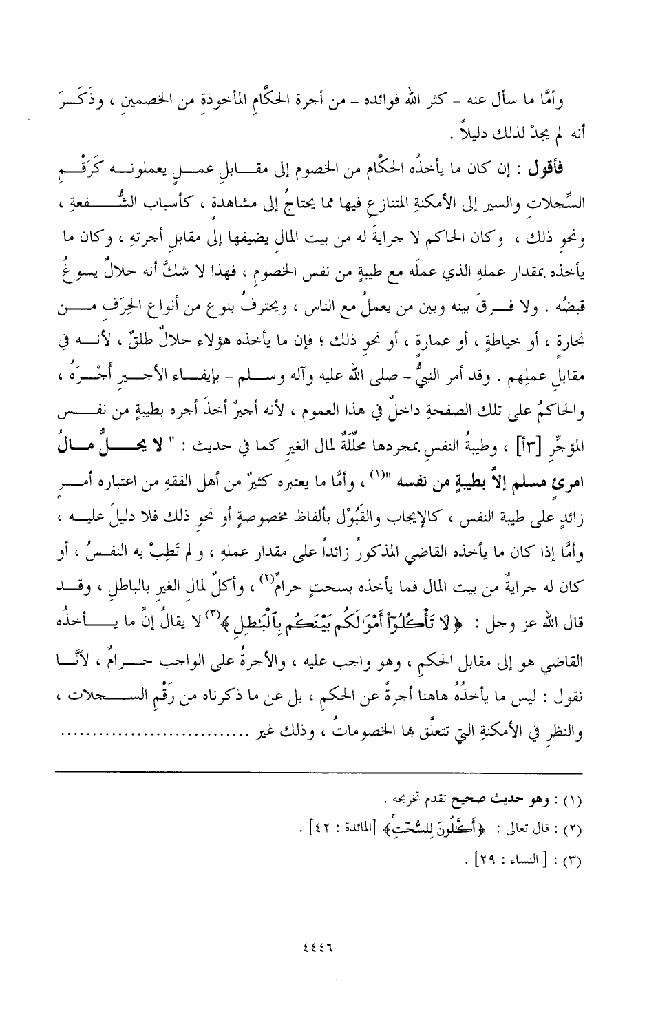 فأقول: إن كان ما يأخذه الحكام من الخصوم إلى مقابل عمل يعملونه كرقم السجلات والسير إلى الأمكنة المتنازع فيها مما يحتاج إلى مشاهدة، كأسباب الشفعة، ونحو ذلك، وكان الحاكم لا جراية له من بيت المال يضيفها إلى مقابل أجرته، وكان ما يأخذه بمقدار عمله الذي عمله مع طيبة من نفس الخصوم، فهذا لا شك أنه حلال يسوغ قبضه. ولا فرق بينه وبين من يعمل مع الناس، ويحترف بنوع من أنواع الحرف من نجارة، أو خياطة، أو عمارة، أو نحو ذلك؛ فإن ما يأخذه هؤلاء حلال طلق، لأنه في مقابل عملهم. وقد أمر النبي - صَلَّى اللهُ عَلَيْهِ وَآلِهِ وَسَلَّمَ - بإيفاء الأجير أجره، والحاكم على تلك الصفحة داخل في هذا العموم، لأنه أجير أخذ أجره بطيبة من نفس المؤجر [3أ]، وطيبة النفس بمجردها محللة لمال الغير كما في حديث: «لا يحل مال امرئ مسلم إلا بطيبة من نفسه» (¬1)، وأما ما يعتبره كثير من أهل الفقه من اعتباره أمر زائد على طيبة النفس، كالإيجاب والقبول بألفاظ مخصوصة أو نحو ذلك فلا دليل عليه، وأما إذا كان ما يأخذه القاضي المذكور زائدًا على مقدار عمله، ولم تطب به النفس، أو كان له جراية من بيت المال فما يأخذه بسحت حرام (¬2)، وأكل لمال الغير بالباطل، وقد قال الله عز وجل: {ولا تأكلوا أموالكم بينكم بالباطل} (¬3) لا يقال إن ما يأخذه القاضي هو إلى مقابل الحكم، وهو واجب عليه، والأجرة على الواجب حرام، لأنا نقول: ليس ما يأخذه هاهنا أجرة عن الحكم، بل عن ما ذكرناه من رقم السجلات، والنظر في الأمكنة التي تتعلق بها الخصومات، وذلك غير ...................................
