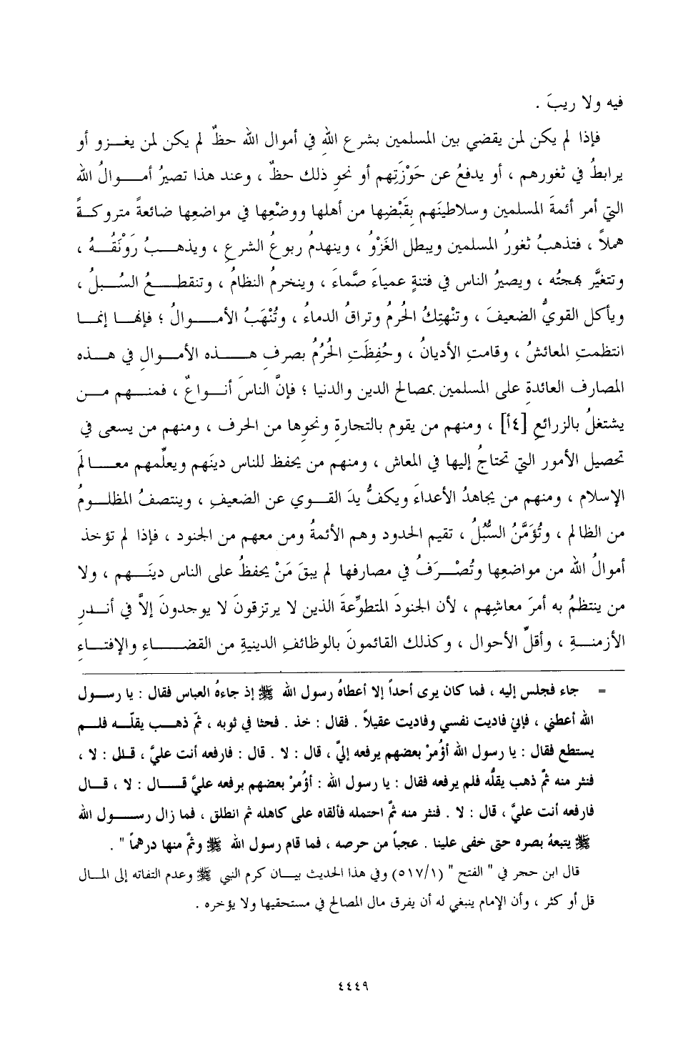 فإذا لم يكن لمن يقضي بين المسلمين بشرع الله في أموال الله حظ لم يكن لمن يغزو أو يرابط في ثغورهم، أو يدفع عن حوزتهم أو نحو ذلك حظ، وعند هذا تصير أموال الله التي أمر أئمة المسلمين وسلاطينهم بقبضها من أهلها ووضعها في مواضعها ضائعة متروكة هملاً، فتذهب ثغور المسلمين ويبطل الغزو، وينهدم ربوع الشرع، ويذهب رونقه، وتتغير بهجته، ويصير الناس في فتنة عمياء صماء، وينخرم النظام، وتنقطع السبل، ويأكل القوي الضعيف، وتنتهك الحرم وتراق الدماء، وتنهب الأموال؛ فإنها إنما انتظمت المعائش، وقامت الأديان، وحفظت الحرم بصرف هذه الأموال في هذه المصارف العائدة على المسلمين بمصالح الدين والدنيا؛ فإن الناس أنواع، فمنهم من يشتغل بالزرائع [4أ]، ومنهم من يقوم بالتجارة ونحوها من الحرف، ومنهم من يسعى في تحصيل الأمور التي تحتاج إليها في المعاش، ومنهم من يحفظ للناس دينهم ويعلمهم معالم الإسلام، ومنهم من يجاهد الأعداء ويكف يد القوي عن الضعيف، وينتصف المظلوم من الظالم، وتؤمن السبل، تقيم الحدود وهم الأئمة ومن معهم من الجنود، فإذا لم تؤخذ أموال الله من مواضعها وتصرف في مصارفها لم يبق من يحفظ على الناس دينهم، ولا من ينتظم به أمر معاشهم، لأن الجنود المتطوعة الذين لا يرتزقون لا يوجدون إلا في أندر الأزمنة، وأقل الأحوال، وكذلك القائمون بالوظائف الدينية من القضاء والإفتاء