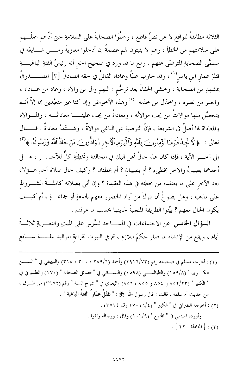 الثلاثة مطابقة للواقع لا عن نص قاطع، وحملوا الصحابة على السلامة حتى أداهم حملهم على سلامتهم من الخطأ، وهم لا يثبتون لهم عصمة إن أدخلوا معاوية ومن شايعه في مسمى الصحابة المترضى عنهم. ومع ما قد ورد في صحيح الخبر أن رئيس الفئة الباغية قتلة عمار بن ياسر (¬1)، وقد حارب عليًا وعاداه القائل في حقه الصادق [3] المصدوق بمشهد من الصحابة، وخشي الجفاء بعد ترحم: اللهم وال من والاه، وعاد من عاداه، وانصر من نصره، واخذل من خذله " (¬2) وهذه الأخواض وإن كنا غير متعبدين بها إلا أنه يتحصل منها موالات من يجب موالاته، ومعاداة من يجب علينا معاداته، والموالاة والمعاداة لها أصل في الشريعة، فإن الترضية عن الباغي موالاة، وشتمه معاداة. قال تعالى: {لا تجد قوما يؤمنون بالله واليوم الآخر يوادون من حاد الله ورسوله} (¬3) إلى آخر الآية، فإذا كان هذا حال أهل البلد في المخالفة وتخطئة كل للآخر، هل أحدهما يصيب والآخر يخطئ؟ أم يصيبان؟ أم يخطئان؟ وكيف حال صلاة أحد هؤلاء بعد الآخر على ما يعتقده من خطئه في هذه العقيدة؟ وإن أتى بصلاته كاملة الشروط على مذهبه، وهل يصوغ أن يترك من أراد الحضور معهم لجمعة أو جماعة، أم كيف يكون الحال معهم؟ بينوا الطريقة المنجية لجايئها بحسب ما عرفتم.