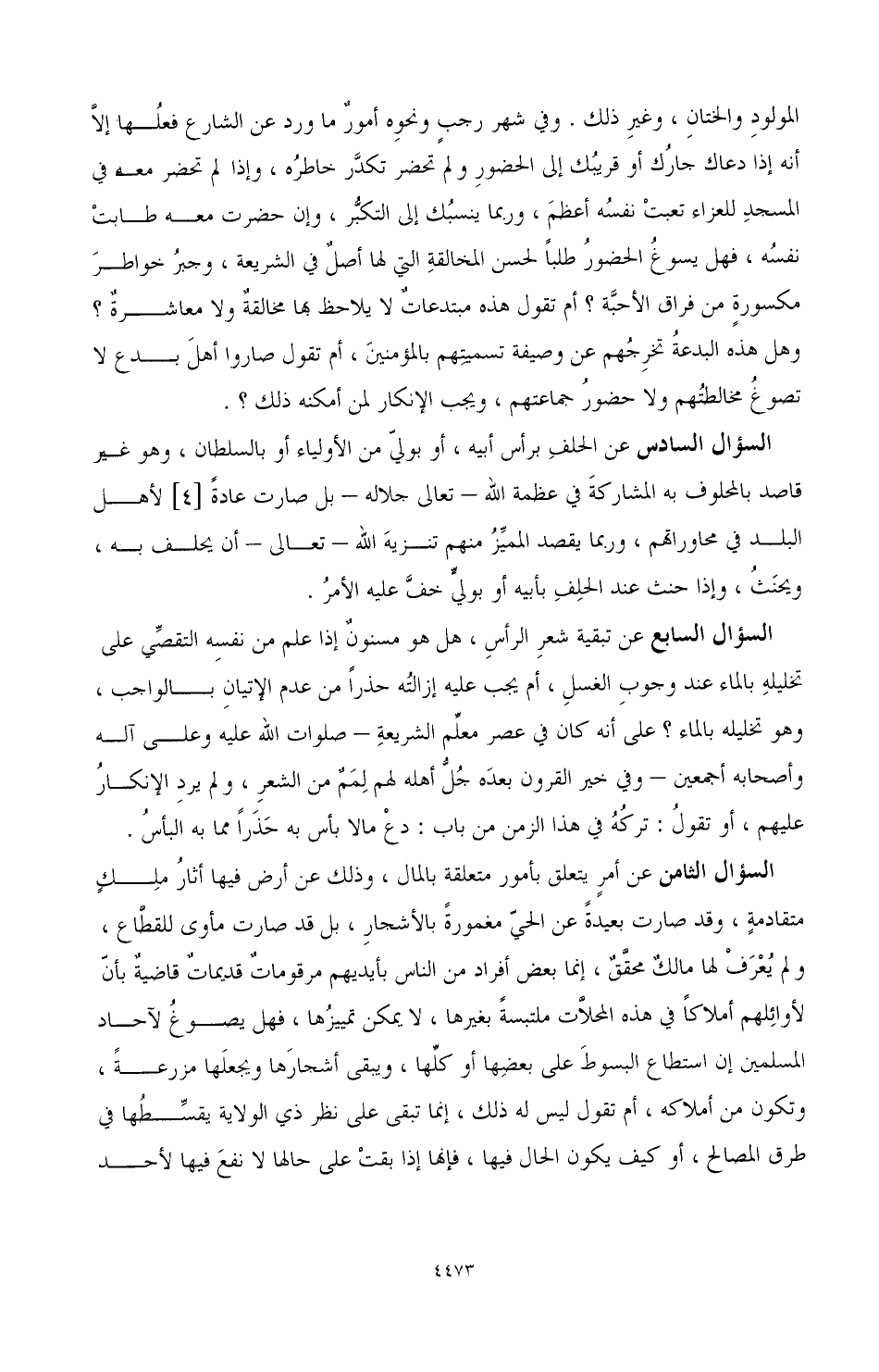 السؤال السابع عن تبقية شعر الرأس، هل هو مسنون إذا علم عن نفسه التقصي على تخليله بالماء عند وجوب الغسل، أم يجب عليه إزالته حذرًا من عدم الإتيان بالواجب، وهو تخليله بالماء؟ على أنه كان في عصر معلم الشريعة - صلوات الله عليه وعلى آله وأصحابه أجمعين - وفي خير القرون بعده جل أهله لهم لمم من الشعر، ولم يرد الإنكار عليهم، أو تقول: تركه في هذا الزمن من باب: دع ما لا بأس به حذرًا مما به البأس.