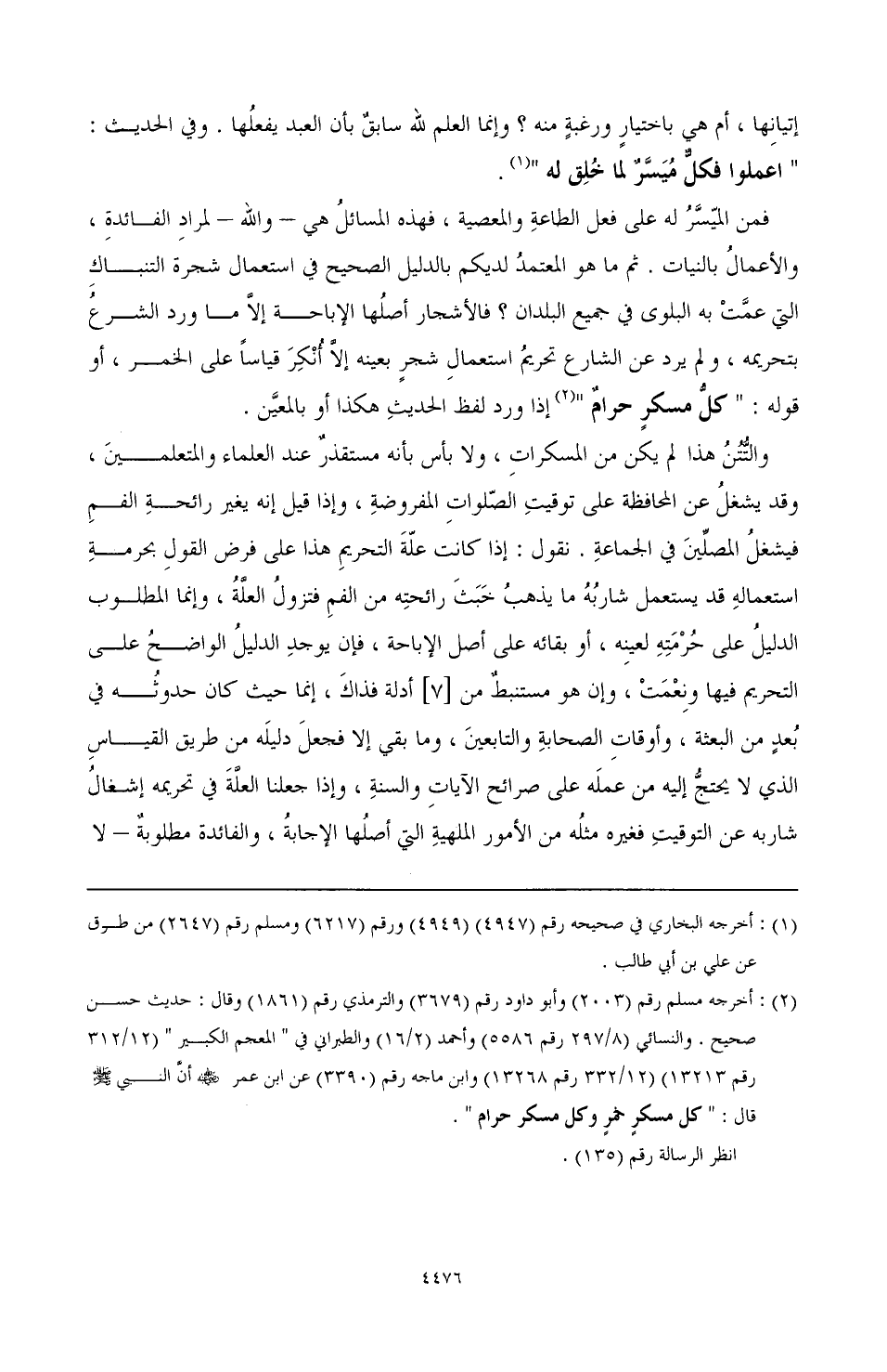 فمن الميسر له على فعل الطاعة والمعصية، فهذه المسائل هي - والله - لمراد الفائدة، والأعمال بالنيات. ثم ما هو المعتمد لديكم بالدليل الصحيح في استعمال شجرة التنباك التي عمت به البلوى في جميع البلدان؟ فالأشجار أصلها الإباحة إلا ما ورد الشرع بتحريمه، ولم يرد عن الشارع تحريم استعمال شجر بعينه إلا أنكر قياسًا على الخمر، أو قوله: «كل مسكر حرام» (¬2) إذا ورد لفظ الحديث هكذا أو بالمعين.