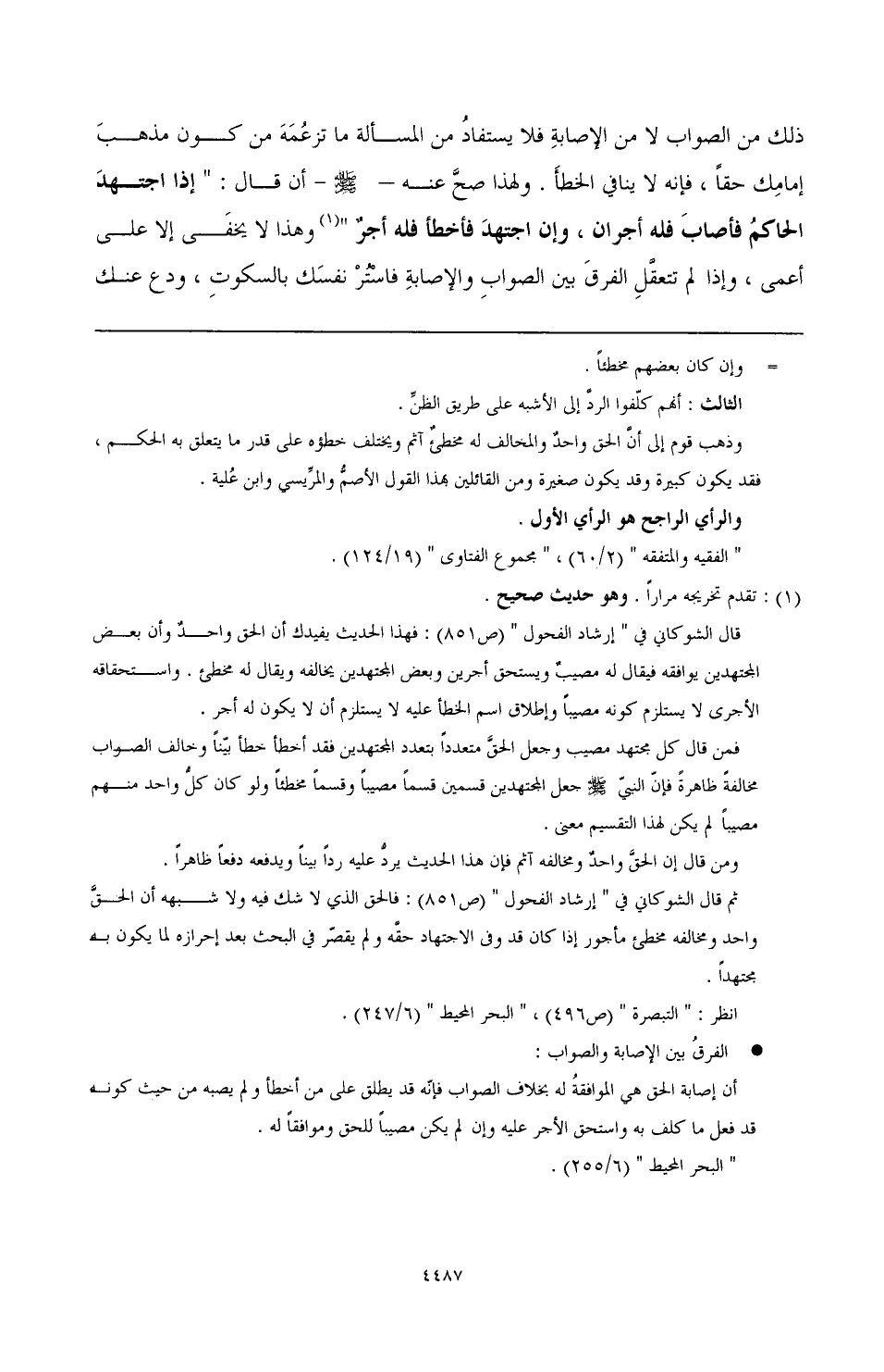 ثم قال الشوكاني في " إرشاد الفحول " (ص851): فالحق الذي لا شك فيه ولا شبهة أن الحق واحد ومخالفه مخطئ مأجور إذا كان قد وفى الاجتهاد حقه ولم يقصر في البحث بعد إحرازه لما يكون به مجتهدًا.