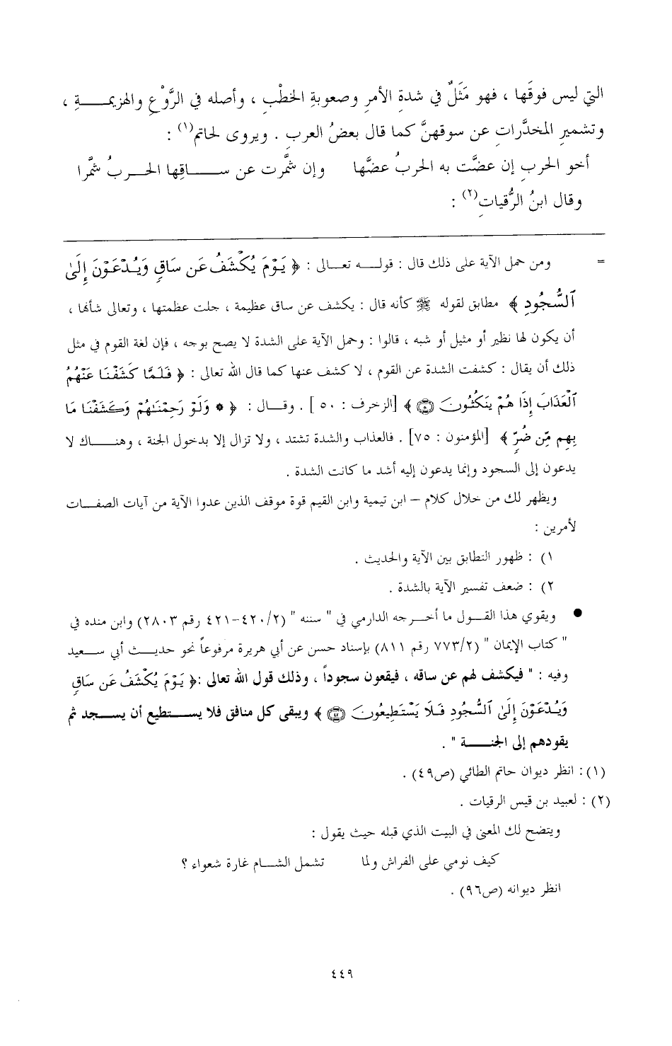 التي ليس فوقها، فهو مثل في شدة الأمر وصعوبة الخطب، وأصله في الروع والهزيمة، وتشمير المخدرات عن سوقهن كما قال بعض العرب. ويروى لحاتم (¬1):