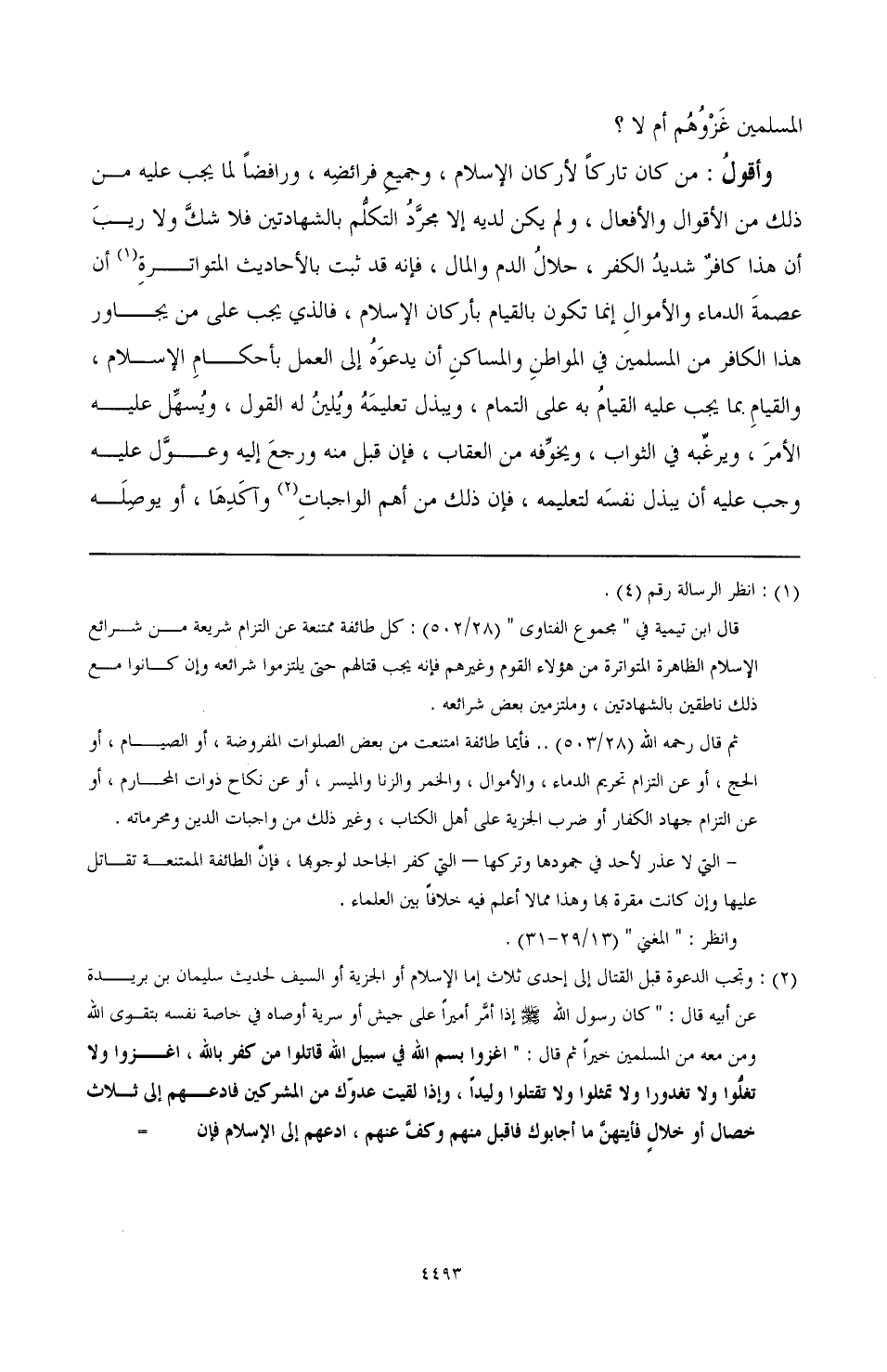 ثم قال رحمه الله (28/ 503) .. فأيما طائفة امتنعت من بعض الصلوات المفروضة، أو الصيام، أو الحج، أو عن التزام تحريم الدماء، والأموال، والخمر والزنا والميسر، أو عن نكاح ذوات المحارم، أو عن التزام جهاد الكفار أو ضرب الجزية على أهل الكتاب، وغير ذلك من واجبات الدين ومحرماته.