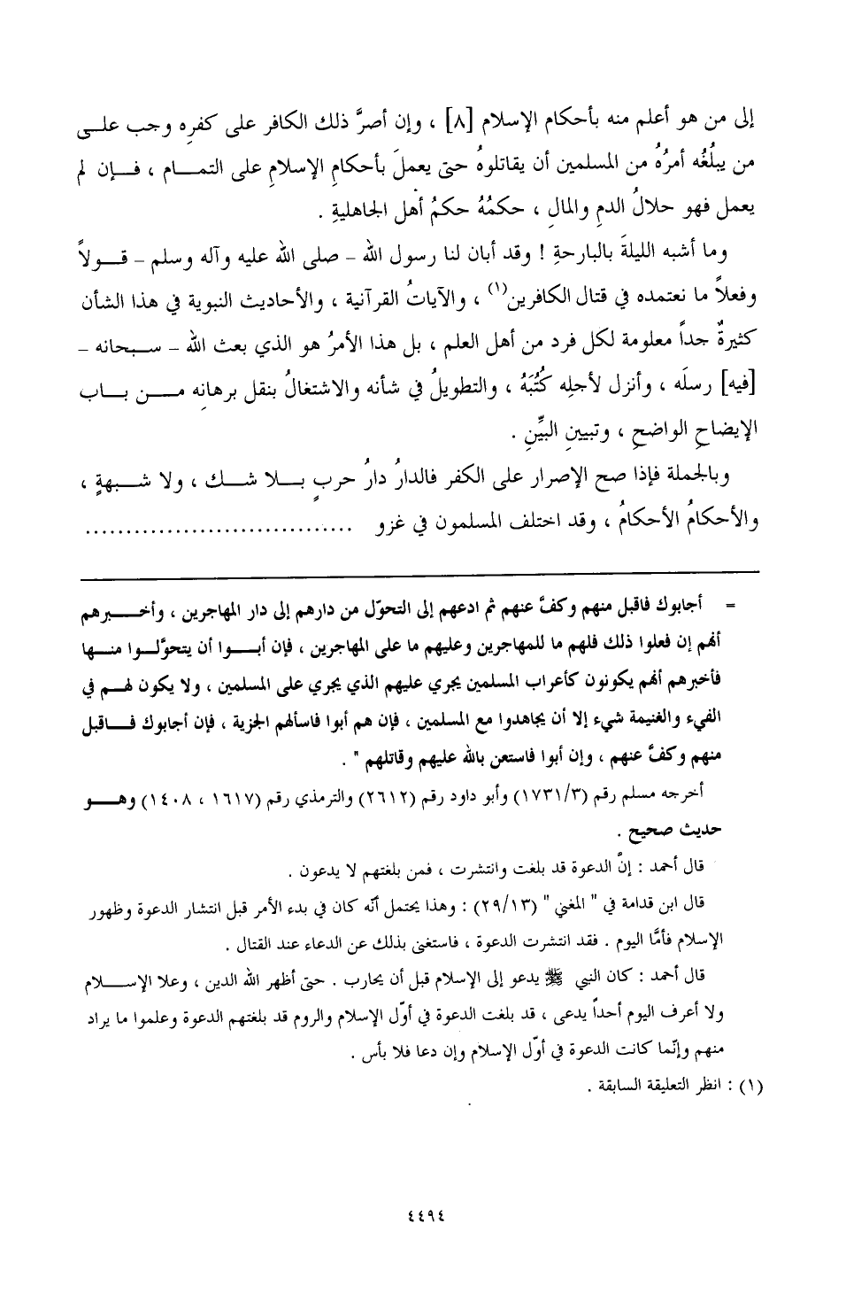 وما أشبه الليلة بالبارحة! وقد أبان لنا رسول الله - صَلَّى اللهُ عَلَيْهِ وَآلِهِ وَسَلَّمَ - قولاً وفعلاً ما نعتمده في قتال الكافرين (¬1)، والآيات القرآنية، والأحاديث النبوية في هذا الشأن كثيرة جدًا معلومة لكل فرد من أهل العلم، بل هذا الأمر هو الذي بعث الله - سبحانه -[فيه] رسله، وأنزل لأجله كتبه، والتطويل في شأنه والاشتغال بنقل برهانه من باب الإيضاح الواضح، وتبيين البين.
