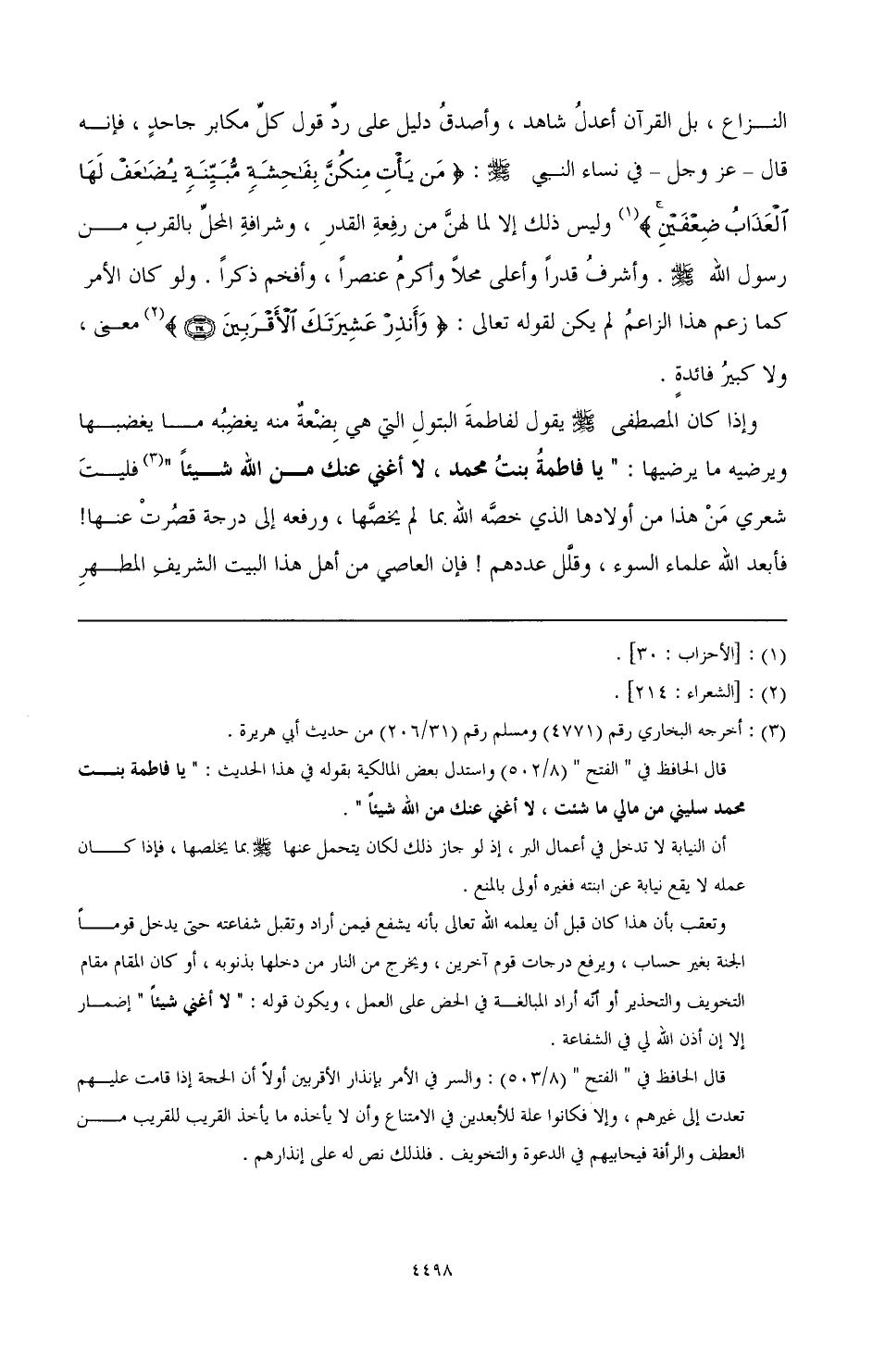 النزاع، بل القرآن أعدل شاهد، وأصدق دليل على رد قول كل مكابر جاحد، فإنه قال - عز وجل - في نساء النبي - صَلَّى اللهُ عَلَيْهِ وَسَلَّمَ -: {يا نساء النبي من يأت منكن بفاحشة مبينة يضاعف لها العذاب ضعفين} (¬1) وليس ذلك إلا لما لهن من رفعة القدر، وشرافة المحل بالقرب من رسول الله - صَلَّى اللهُ عَلَيْهِ وَسَلَّمَ -. وأشرف قدرًا وأعلى محلاً وأكرم عنصرًا، وأفخم ذكرًا. ولو كان الأمر كما زعم هذا الزاعم لم يكن لقوله تعالى: {وأنذر عشيرتك الأقربين} (¬2) معنى، ولا كبير فائدة.