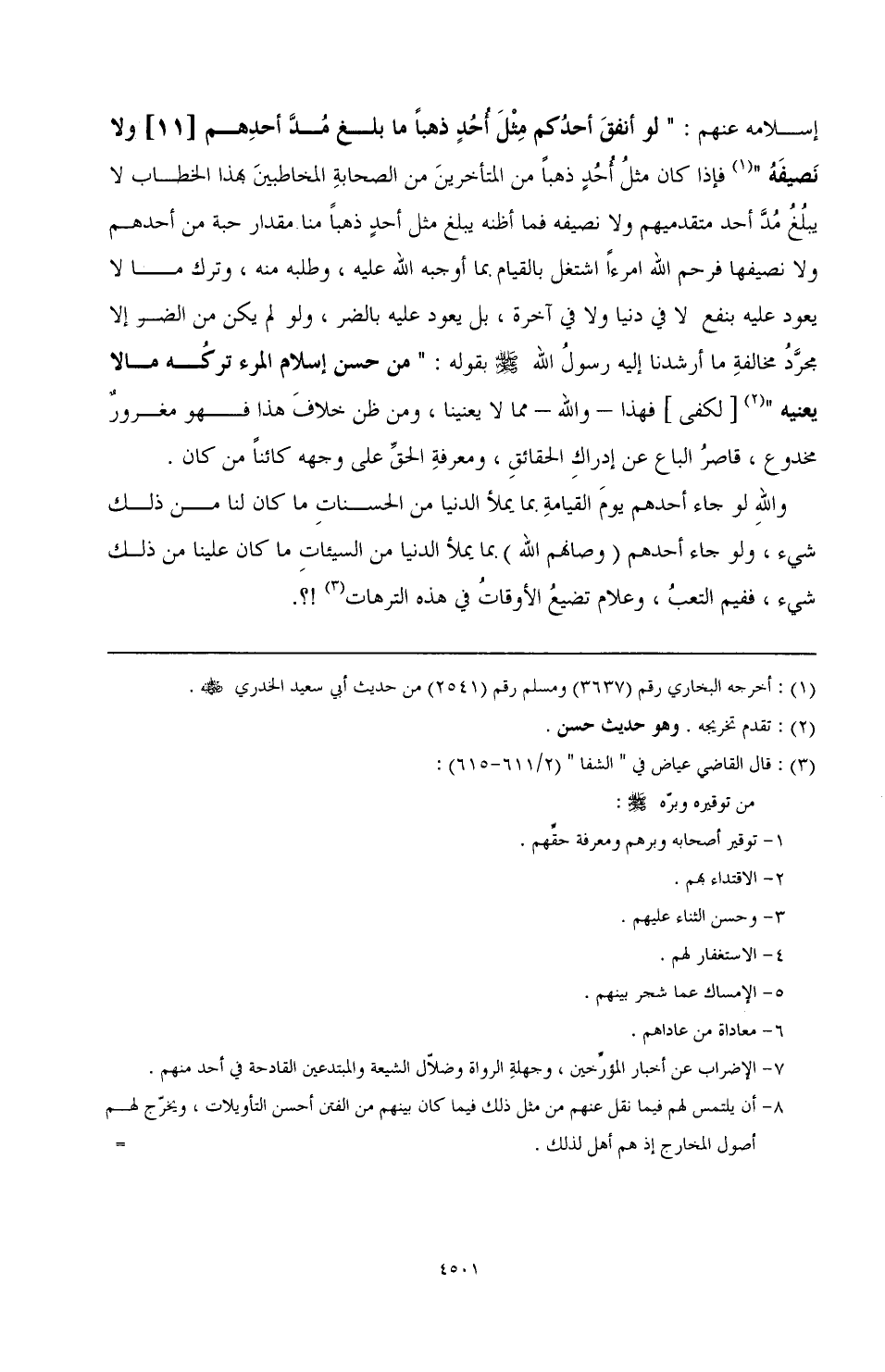 إسلامه عنهم: " لو أنفق أحدكم مثل أحد ذهبًا ما بلغ مد أحدهم [11] ولا نصيفه " (¬1) فإذا كان مثل أحد ذهبًا من المتأخرين من الصحابة المخاطبين بهذا الخطاب لا يبلغ مد أحد متقدميهم ولا نصيفه فما أظنه يبلغ مثل أحد ذهبًا منا مقدار حبة من أحدهم ولا نصيفها، فرحم الله امرءًا اشتغل بالقيام بما أوجبه الله عليه، وطلبه منه، وترك ما لا يعود عليه بنفع لا في دنيا ولا في آخرة، بل يعود عليه بالضر، ولو لم يكن من الضر إلا مجرد مخالفة ما أرشدنا إليه رسول الله - صَلَّى اللهُ عَلَيْهِ وَسَلَّمَ - بقوله: " من حسن إسلام المرء تركه ما لا يعنيه " (¬2) [لكفى] فهذا - والله - مما لا يعنينا، ومن ظن خلاف هذا فهو مغرور مخدوع، قاصر الباع عن إدراك الحقائق، ومعرفة الحق على وجهه كائنًا من كان.