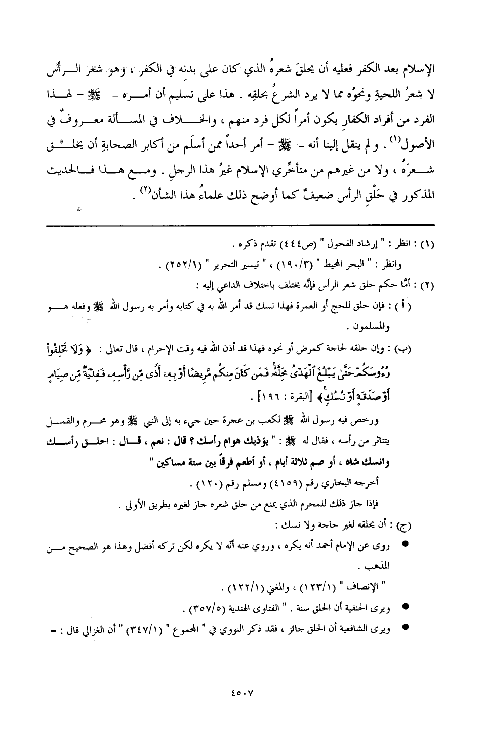 الإسلام بعد الكفر فعليه أن يحلق شعره الذي كان على بدنه في الكفر، وهو شعر الرأس لا شعر اللحية ونحوه مما لا يرد الشرع بحلقه. هذا على تسليم أن أمره - صَلَّى اللهُ عَلَيْهِ وَسَلَّمَ - لهذا الفرد من أفراد الكفار يكون أمرًا لكل فرد منهم، والخلاف في المسألة معروف في الأصول (¬1). ولم ينقل إلينا أنه - صَلَّى اللهُ عَلَيْهِ وَسَلَّمَ - أمر أحدًا ممن أسلم من أكابر الصحابة أن يحلق شعره، ولا من غيرهم من متأخري الإسلام غير هذا الرجل. ومع هذا فالحديث المذكور في حلق الرأس ضعيف كما أوضح ذلك علماء هذا الشأن (¬2).