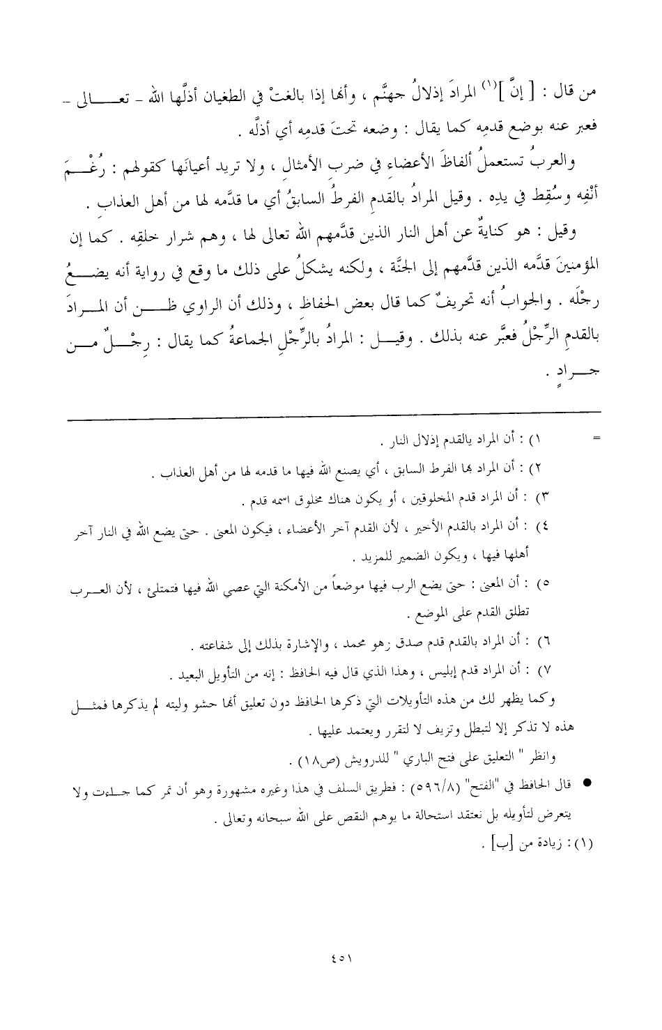 وقيل: هو كناية عن أهل النار الذين قدمهم الله تعالى لها، وهم شرار خلقه. كما إن المؤمن قدمه الذين قدمهم إلى الجنة، ولكنه يشكل على ذلك ما وقع في رواية أنه يضع رجله. والجواب أنه تحريف كما قال بعض الحفاظ، وذلك أن الراوي ظن أن المراد بالقدم الرجل فعبر عنه بذلك. وقيل: المراد بالرجل الجماعة كما يقال: رجل من جراد.