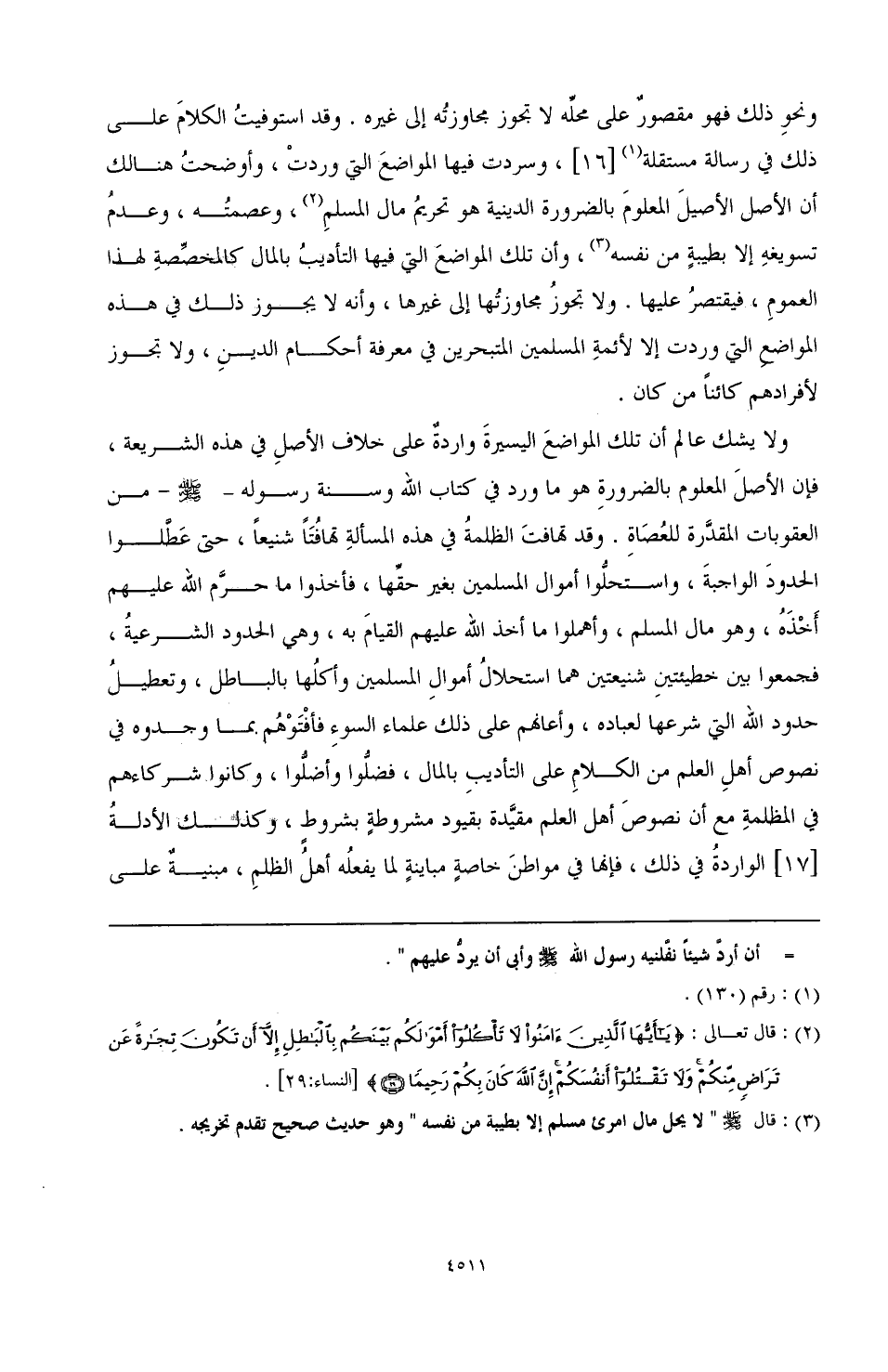 ونحو ذلك فهو مقصور على محله لا تجوز مجاوزته إلى غيره. وقد استوفيت الكلام على ذلك في رسالة مستقلة (¬1) [16]، وسردت فيها المواضع التي وردت، وأوضحت هنالك أن الأصل الأصيل المعلوم بالضرورة الدينية هو تحريم مال المسلم (¬2)، وعصمته، وعدم تسويغه إلا بطيبة من نفسه (¬3)، وأن تلك المواضع التي فيها التأديب بالمال كالمخصصة لهذا العموم، فيقتصر عليها. ولا تجوز مجاوزتها إلى غيرها، وأنه لا يجوز ذلك في هذه المواضع التي وردت إلا لأئمة المسلمين المتبحرين في معرفة أحكام الدين، ولا تجوز لأفرادهم كائنًا من كان.