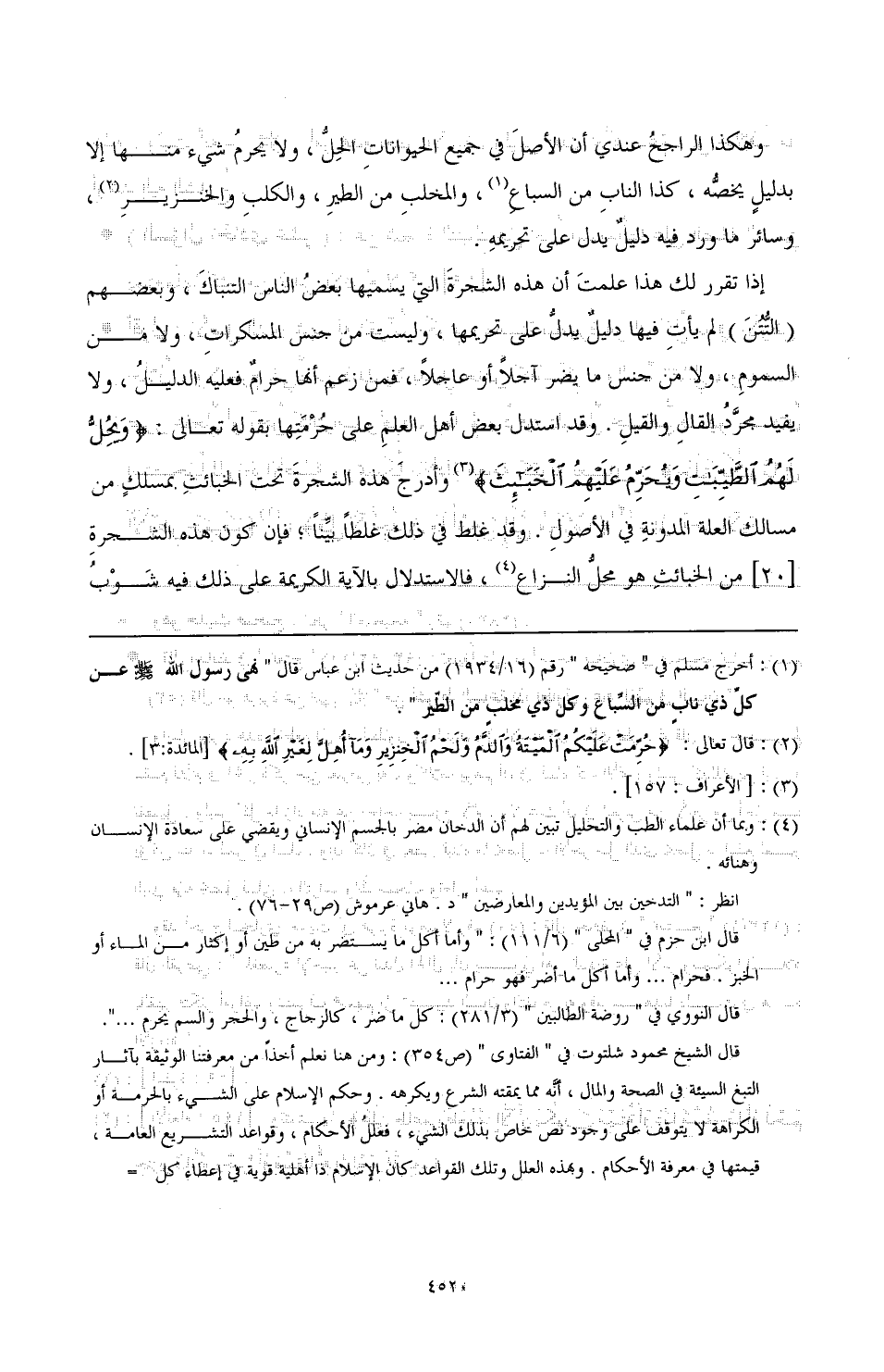 وهكذا الراجح عندي أن الأصل في جميع الحيوانات الحل، ولا يحرم شيء منها إلا بدليل يخصه، كذا الناب من السباع (¬1)، والمخلب من الطير، والكلب والخنزير (¬2)، وسائر ما ورد فيه دليل يدل على تحريمه.