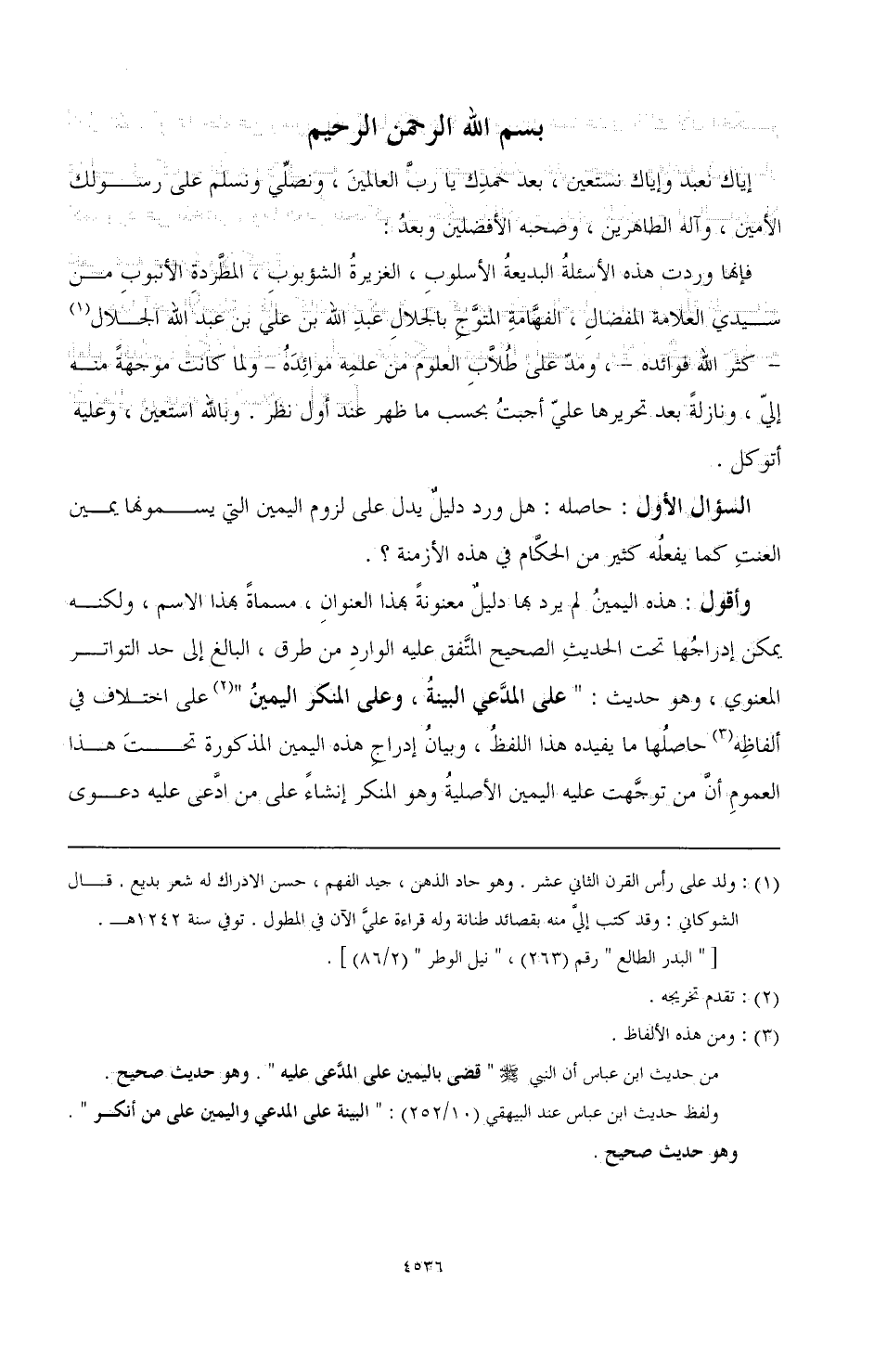 فإنها وردت هذه الأسئلة البديعة الأسلوب، الغزيرة الشؤبوب، المطردة الأنبوب من سيدي العلامة المفضال، الفهامة المتوج بالجلال عبد الله بن علي بن عبد الله الجلال (¬1) - كثر الله فوائده -، ومد على طلاب العلوم من علمه موائده - ولما كانت موجهة منه إلي، ونازلة بعد تحريرها علي أجبت بحسب ما ظهر عند أول نظر. وبالله أستعين، وعليه أتوكل.