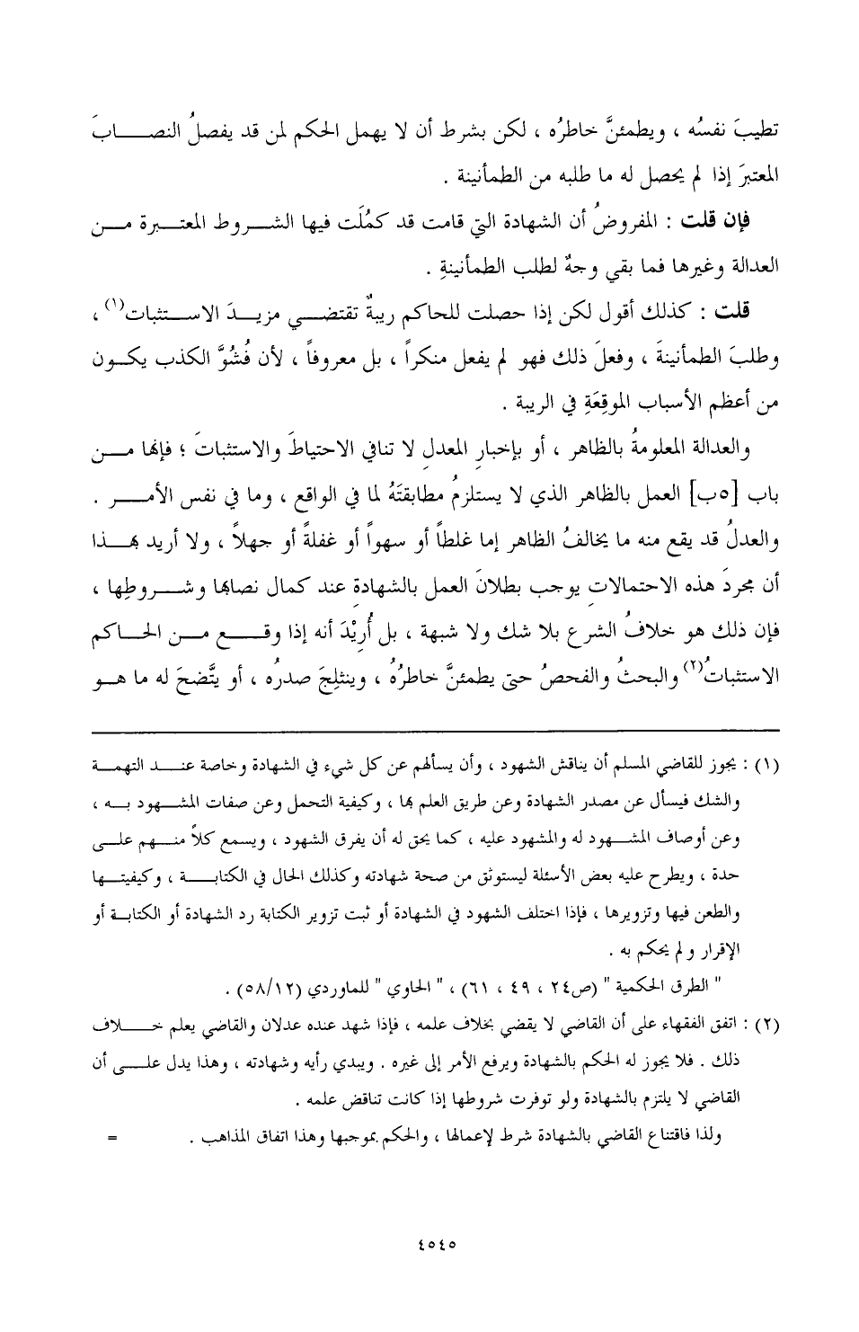 (¬1) يجوز للقاضي أن يناقش الشهود، وأن يسألهم عن كل شيء في الشهادة وخاصة عند التهمة والشك فيسأل عن مصدر الشهادة وعن طريق العلم بها، وكيفية التحمل وعن صفات المشهود به، وعن أوصاف المشهود له والمشهود عليه، كما يحق له أن يفرق الشهود، ويسمع كلاً منهم على حدة، ويطرح عليه بعض الأسئلة ليستوثق من صحة شهادته وكذلك الحال في الكتابة وكيفيتها والطعن فيها وتزويرها، فإذا اختلف الشهود في الشهادة أو ثبت تزوير الكتابة رد الشهادة أو الكتابة أو الإقرار ولم يحكم به.