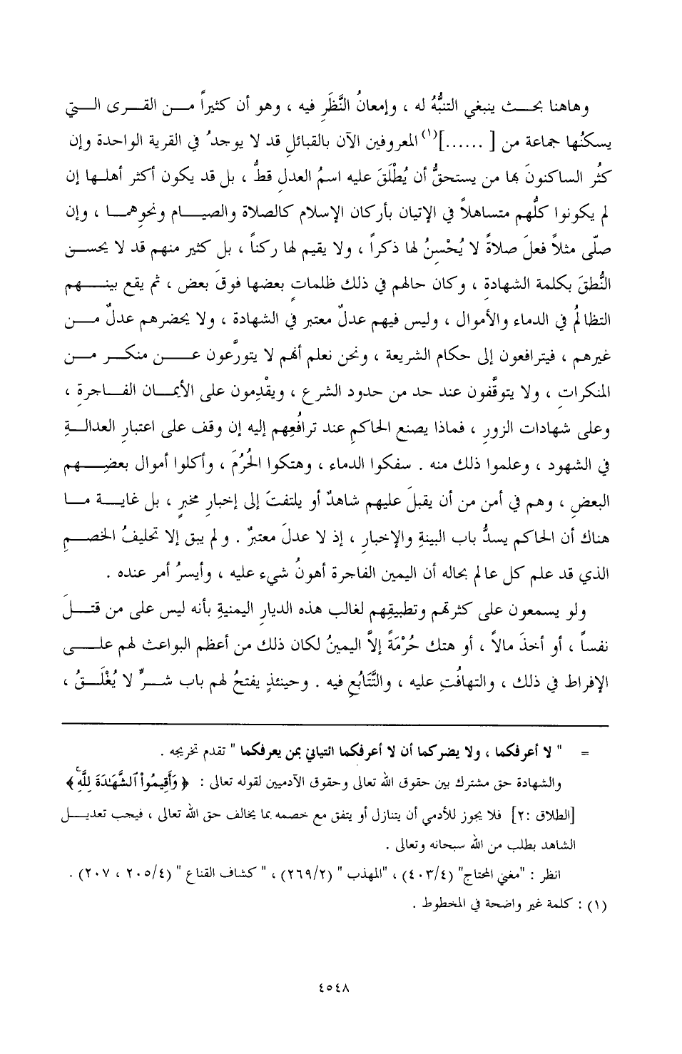 وهاهنا بحث ينبغي التنبه له، وإمعان النظر فيه، وهو أن كثيرًا من القرى التي يسكنها جماعة من [ ..... ] (¬1) المعروفين الآن بالقبائل قد لا يوجد في القرية الواحدة وإن كثر الساكنون بها من يستحق أن يطلق عليه اسم العدل قط، بل قد يكون أكثر أهلها إن لم يكونوا كلهم متساهلاً في الإتيان بأركان الإسلام كالصلاة والصيام ونحوهما، وإن صلى مثلاً فعل صلاة لا يحسن لها ذكرًا، ولا يقيم لها ركنًا، بل كثير منهم قد لا يحسن النطق بكلمة الشهادة، وكان حالهم في ذلك ظلمات بعضها فوق بعض، ثم يقع بينهم التظالم في الدماء والأموال، وليس فيهم عدل معتبر في الشهادة، ولا يحضرهم عدل من غيرهم، فيترافعون إلى حكام الشريعة، ونحن نعلم أنهم لا يتورعون عن منكر من المنكرات، ولا يتوقفون عند حد من حدود الشرع، ويقدمون على الأيمان الفاجرة، وعلى شهادات الزور، فماذا يصنع الحاكم عند ترافعهم إليه إن وقف على اعتبار العدالة في الشهود، وعلموا ذلك منه. سفكوا الدماء، وهتكوا الحرم، وأكلوا أموال بعضهم البعض، وهم في أمن من أن يقبل عليهم شاهد أو يلتفت إلى إخبار مخبر، بل غاية ما هناك أن الحاكم يسد باب البينة والإخبار، إذ لا عدل معتبر. ولم يبق إلا تحليف الخصم الذي قد علم كل عالم بحاله أن اليمين الفاجرة أهون شيء عليه، وأيسر أمر عنده.