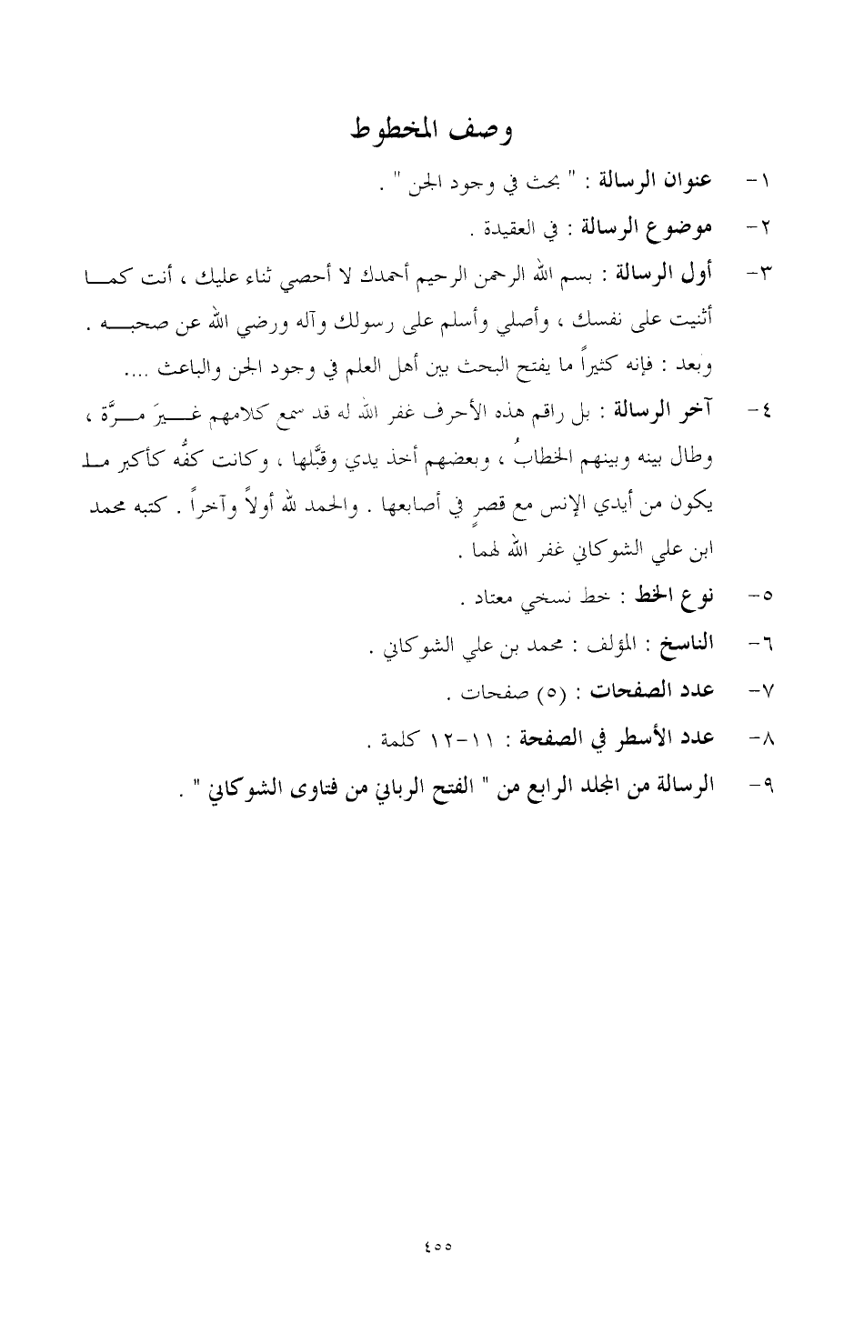 3 - أول الرسالة: بسم الله الرحمن الرحيم أحمدك لا أحصي ثناء عليك، أنت كما أثنيت على نفسك، وأصلي وأسلم على رسولك وآله ورضي الله عن صحبه. وبعد: فإنه كثيرا ما يفتح البحث بين أهل العلم في وجود الجن والباعث. . . .