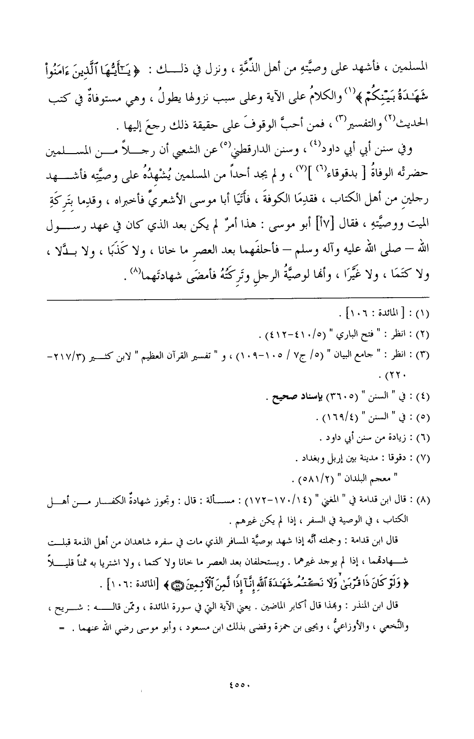 (¬8) قال ابن قدامة في " المغني " (14/ 170 - 172): مسألة: قال: وتجوز شهادة الكفار من أهل الكتاب، في الوصية في السفر، إذا لم يكن غيرهم.