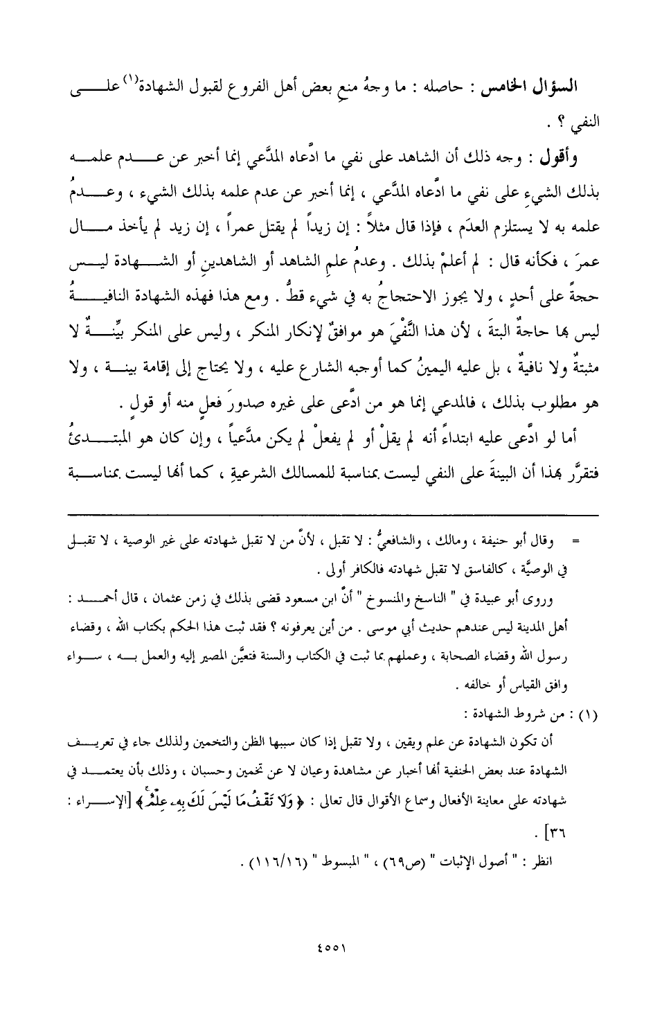 السؤال الخامس: حاصله: ما وجه منع بعض أهل الفروع لقبول الشهادة (¬1) على النفي؟.