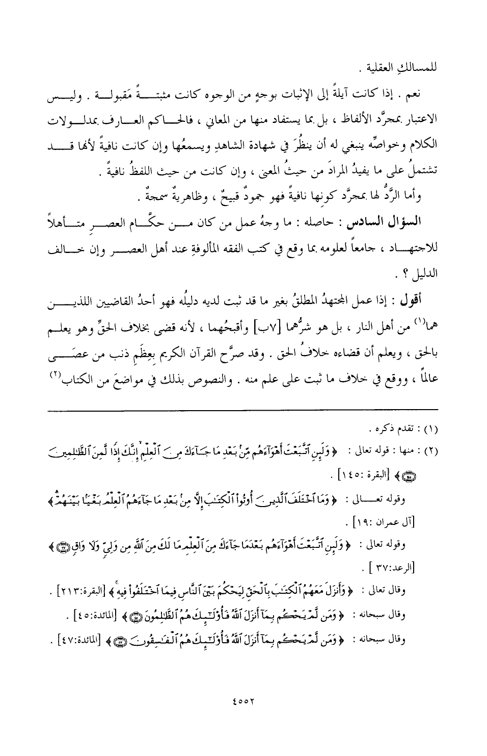 السؤال السادس: حاصله: ما وجه عمل من كان من حكام العصر متأهلاً للاجتهاد، جامعًا لعلومه بما وقع في كتب الفقه المألوفة عند أهل العصر وإن خالف الدليل؟.