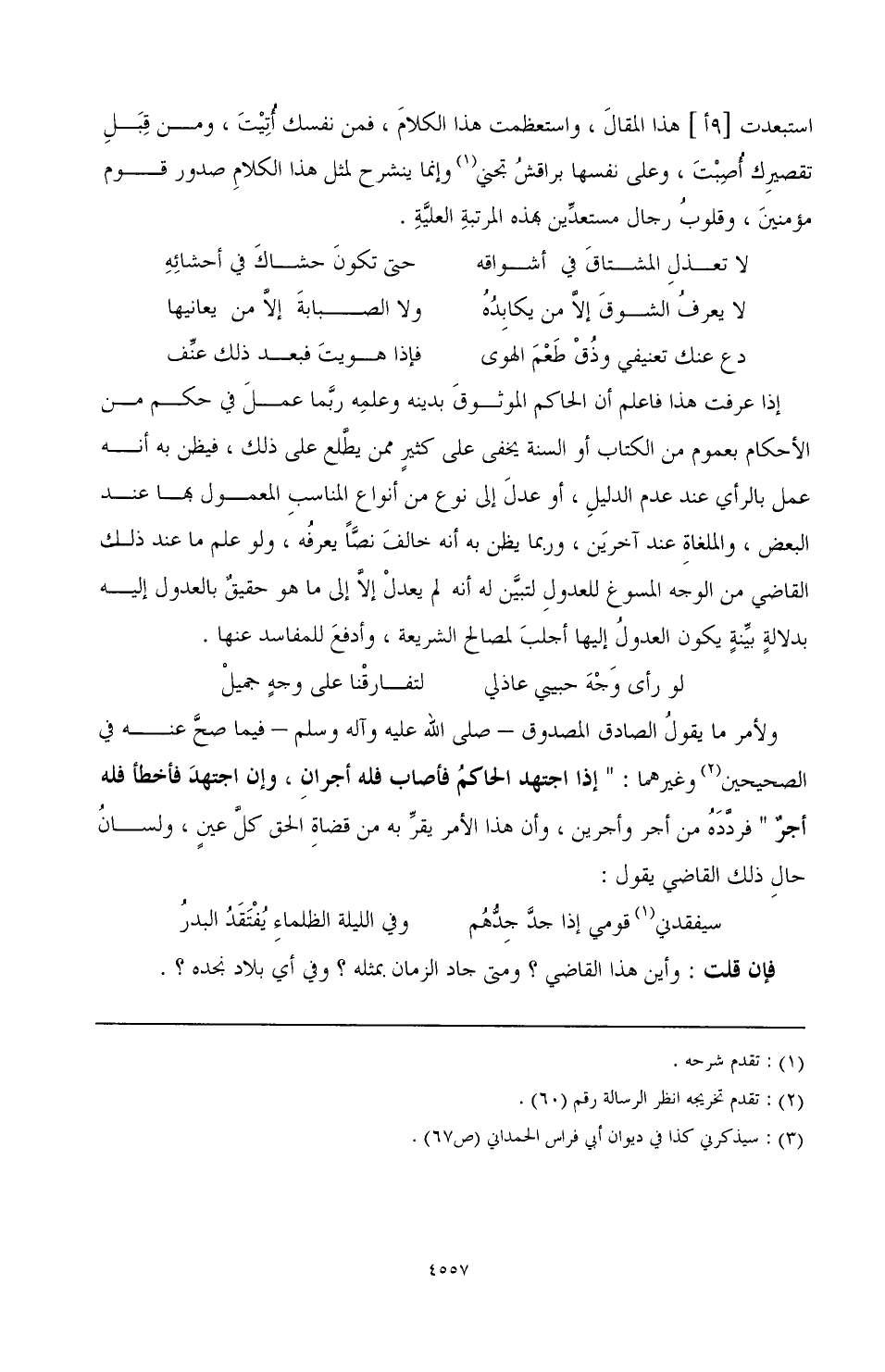 ولأمر ما يقول الصادق المصدوق - صَلَّى اللهُ عَلَيْهِ وَآلِهِ وَسَلَّمَ - فيما صح عنه في الصحيحين (¬2) وغيرهما: " إذا اجتهد الحاكم فله أجران، وإن اجتهد فأخطأ فله أجر " فردده من أجر وأجرين، وأن هذا الأمر يقر به من قضاة الحق كل عين، ولسان حال ذلك القاضي يقول: