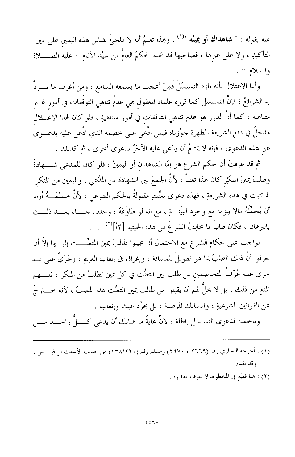 وأما الاعتلال بأنه يلزم التسلسل فمن أعجب ما يسمعه السامع، ومن أغرب ما ترد به الشرائع؛ فإن التسلسل كما قرره علماء المعقول هي عدم تناهي التوقفات في أمور غير متناهية، كما أن الدور هو عدم تناهي التوقفات في أمور متناهية، فلو كان لهذا الاعتلال مدخل في دفع الشريعة المطهرة لجوزناه فيمن ادعى على خصمه الذي ادعى عليه بدعوى غير هذه الدعوى، فإنه لا يمتنع أن يدعي عليه الآخر بدعوى أخرى، ثم كذلك.
