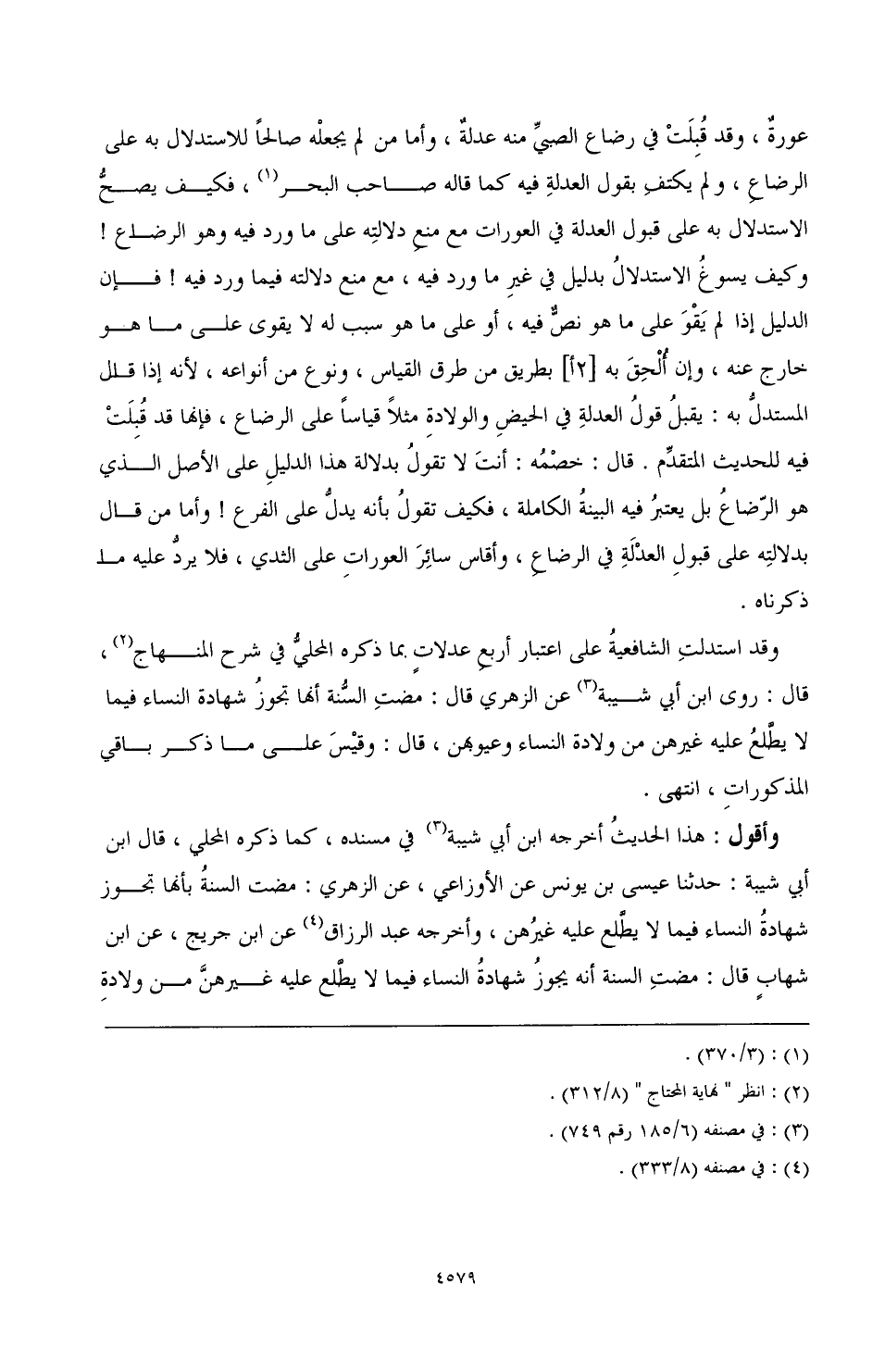 وأقول: هذا الحديث أخرجه ابن أبي شيبة (¬4) في مسنده، كما ذكره المحلي، قال ابن أبي شيبة: حدثنا عيسى بن يونس الأوزاعي، عن الزهري: مضت السنة بأنها تجوز شهادة النساء فيما لا يطلع عليه غيرهن، وأخرجه عبد الرازق (¬5) عن ابن جريج، عن ابن شهاب، قال: مضت السنة أنه تجوز شهادة النساء فيما لا يطلع عليه غيرهن من ولادة