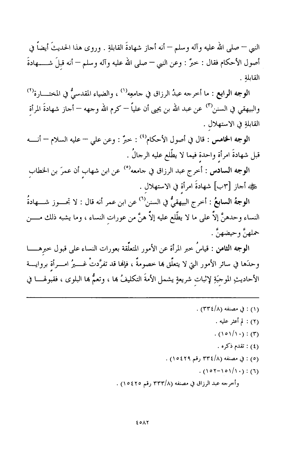 الوجه الرابع: ما أخرجه عبد الرازق في جامعه (¬1)، والضياء المقدسي في المختارة (¬2) والبيهقي في السنن (¬3) عن عبد الله بن يحيى أن عليًا - كرم الله وجهه - أجاز شهادة المرأة القابلة في الاستهلال.