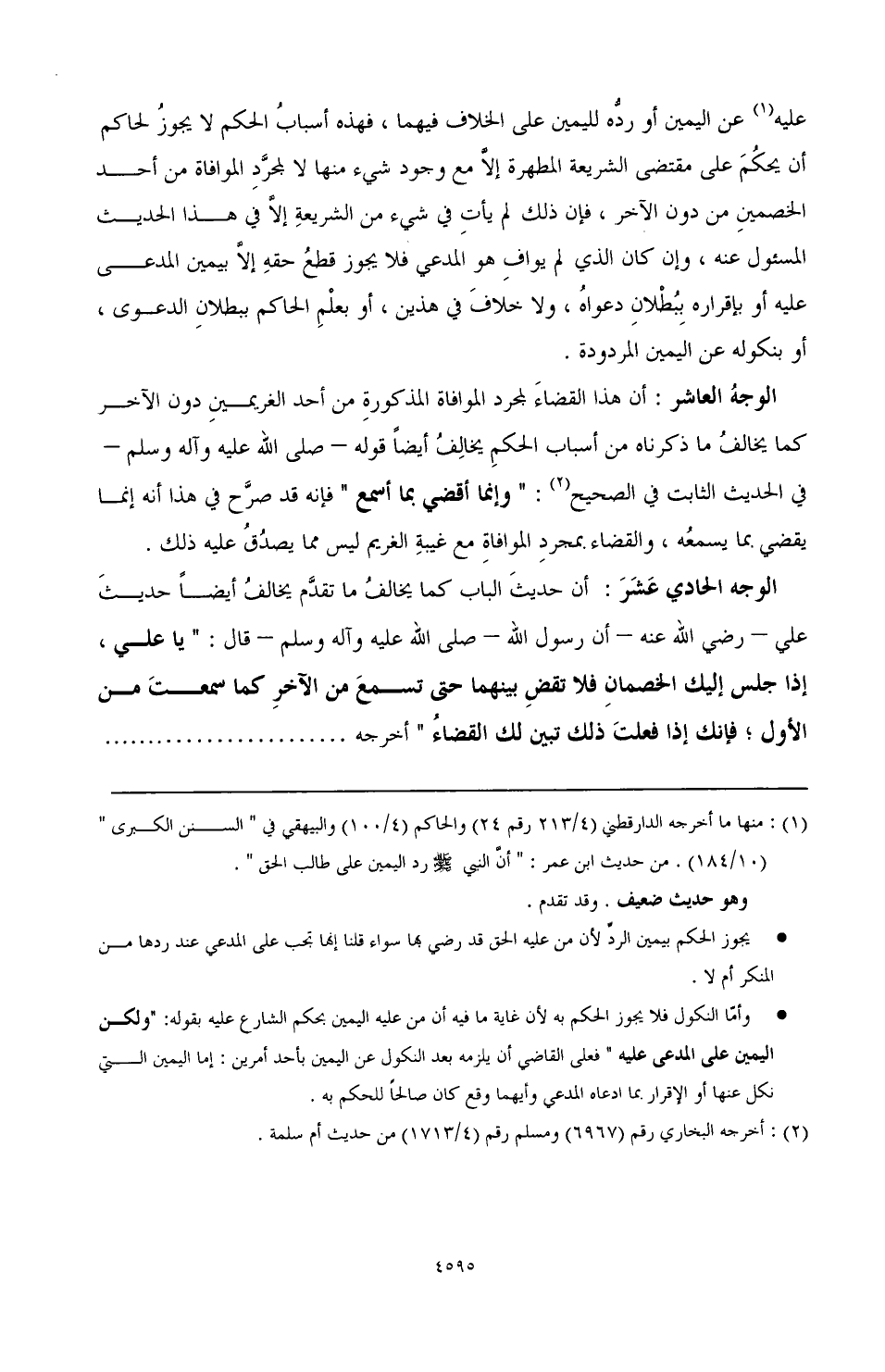 الوجه الحادي عشر: أن حديث الباب كما يخالف ما تقدم يخالف أيضًا حديث علي - رضي الله عنه - أن رسول الله - صَلَّى اللهُ عَلَيْهِ وَآلِهِ وَسَلَّمَ - قال: " يا علي، إذا جلس إليك الخصمان فلا تقض بينهما حتى تسمع من الآخر كما سمعت من الأول؛ فإنك إذا فعلت ذلك تبين لك القضاء " أخرجه ..........................